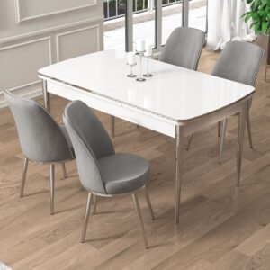 Canisa Pale Serisi 80X132 Açılabilir Beyaz Mutfak Masa Takımı 4 Sandalye Krom Detay