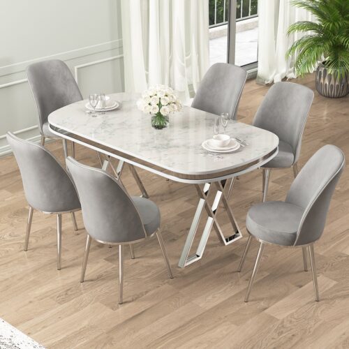 Are Serisi 80 x 132 cm Açılabilir Mdf Beyaz Mermer Desen Masa Takımı 6 Sandalye Gümüş Halkalı