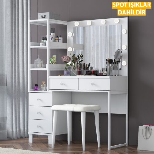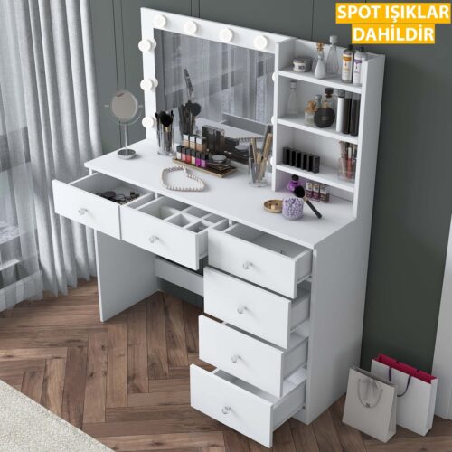 Rani BJ127 Hollywood Işıklı Aynalı Kulis Makyaj Masası 6 Çekmeceli Takı Düzenleyici Beyaz