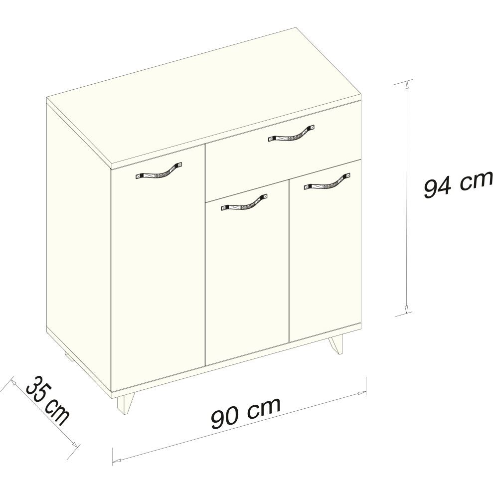 Ürün Ölçüleri Yükseklik: 94 cm Genişlik: 90 cm Derinlik: 35 cm Ürünümüz Avrupa E1 Kalite standartlarında, Çevre ve çocuk sağlığına uygun malzemeler kullanılarak üretilmiştir. Ürünümüzde 18 mm. kalınlığında Parlak Beyaz 1. sınıf melamin kaplı yonga levha kullanılmıştır. Ürünümüzde kenar bantları 0,40 mm. PVC bant kullanılarak üretilmiştir. Ürünümüz özel kutularında demonte olarak sizlere gönderilir. Ürünlerimiz demonte şekilde gönderilmektedir. Kurulum müşteriye aittir. Ürün montajı Alyan vida sistemi ile yapılmaktadır. Ürünlerinizde defalarca söküp tekrar kurulum sağlayabilirsiniz, ürünlerinizi farklı mekânlara taşıyabilirsiniz. Montaj kutunuzun içerisinde her türlü bağlantı aparatınız ve kurulum şemanız bulunmaktadır, kullanacağınız vida ve diğer ekipmanlar ayrı ayrı paketlenerek isimlendirilmiştir. Ürün parçalarına rahat montaj yapabilmeniz için kurulum şeması ile uyumlu numaralar verilmiştir. Ürün resmindeki aksesuarlar ürüne dahil değildir.