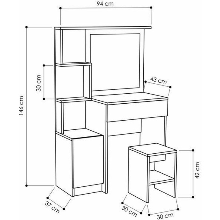AE-4002 Novella Tuvalet Masası Puflu Minderli , Dolaplı, Çekmeceli Makyaj Masası, Çok Raflı, Beyaz, , Aynalı Yükseklik: 146 cm ; Genişlik: 94 cm ; Derinlik: 43 cm ;Ürünümüz Avrupa E1 standartlarında, Çevre ve çocuk sağlığına uygun malzemeler kullanılarak üretilmiştir. ;Ürünümüzde 18 mm. kalınlığında Parlak Beyaz melamin kaplı yonga levha kullanılmıştır. ;Ürünümüzde kenar bantları 0,40 mm. PVC bant kullanılarak üretilmiştir. ;Ürünümüz özel kutularında demonte olarak sizlere gönderilir. ;Ürün montajı Alyan vida sistemi ile yapılmaktadır. ;Ürünlerinizde defalarca söküp tekrar sağlayabilir, ürünlerinizi farklı mekânlara taşıyabilirsiniz. ;Montaj kutunuzun içerisinde her türlü bağlantı aparatınız ve şemanız bulunmaktadır, kullanacağınız vida ve diğer ekipmanlar ayrı ayrı paketlenerek isimlendirilmiştir. ;Ürün parçalarına rahat montaj yapabilmeniz için şeması ile uyumlu numaralar verilmiştir.