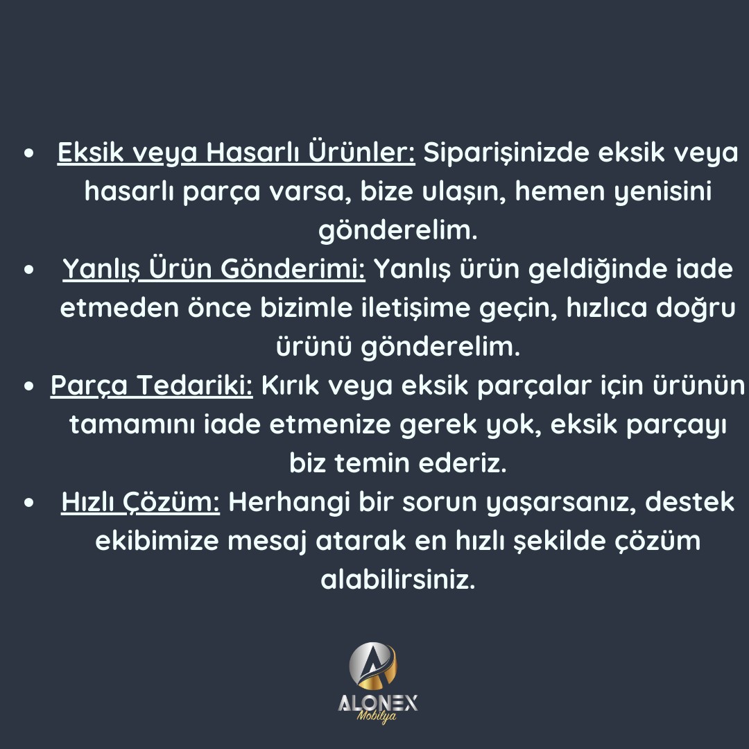• Satın aldığınız ürünlerin hiçbir zarar görmeden tarafınıza ulaşabilmesi için yüksek kalite standartlarında dolgu malzemeleri kullanılarak paketleme yapılmaktadır , fakat nadiren de olsa kargo taşıma sürecinde ürünlerin bazı parçaları zarar görebilmektedir. Hasarlı parçaların numaralarını üzerindeki etiketlere bakarak bize iletmeniz durumunda bu parçaların yenileri tarafınıza kargo ile gönderilmektedir.