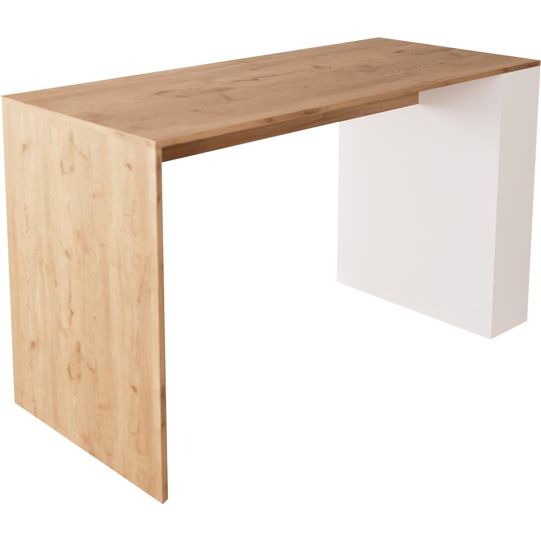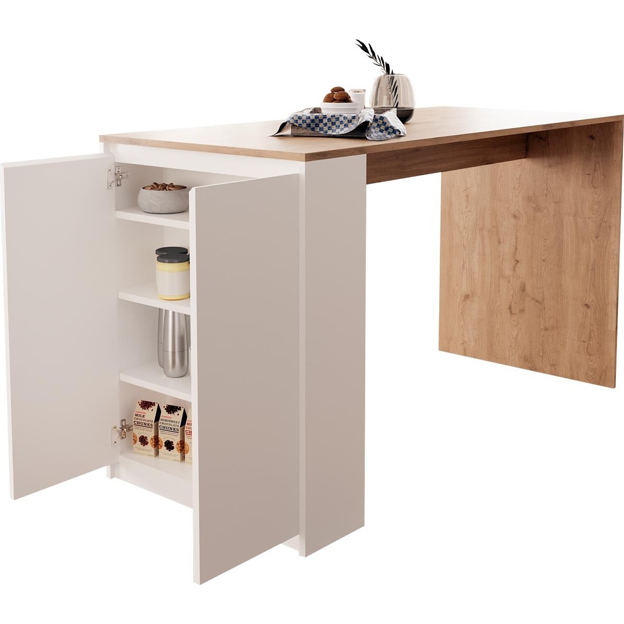 ahşap üst ve beyaz gövdeli edgar bar masası, depolamalı, karşılıklı oturmalı ada mutfak masası.