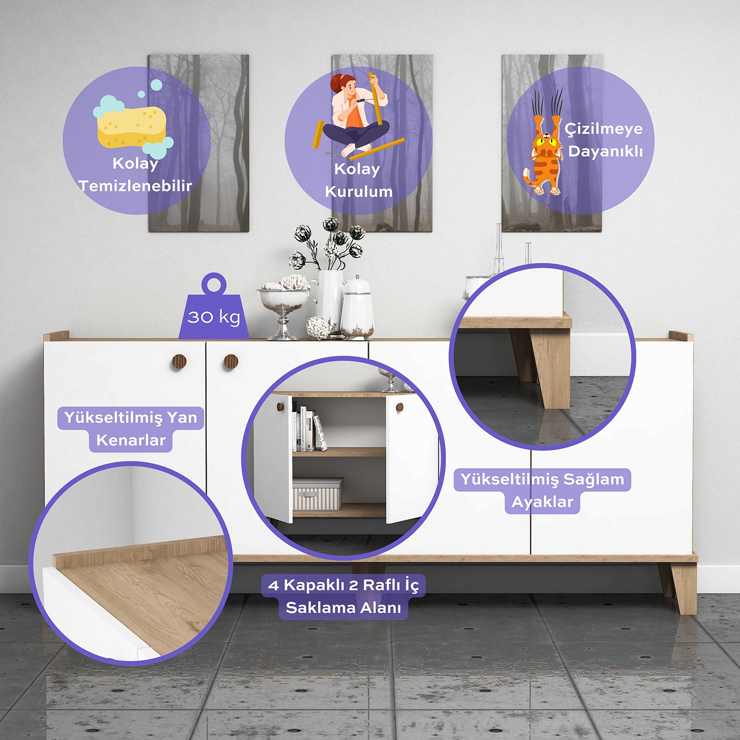 H3020 Sümer Konsol 180 cm – Sepet – Beyaz, 4 Dolaplı, Geniş Depolama Alanı, Çok Amaçlı Kullanım, Modern, Ayaklı, Suntalam, Kapaklı, Oturma Odası, Salon Konsolu, Tv Ünitesi, 80’’ için ideal alan