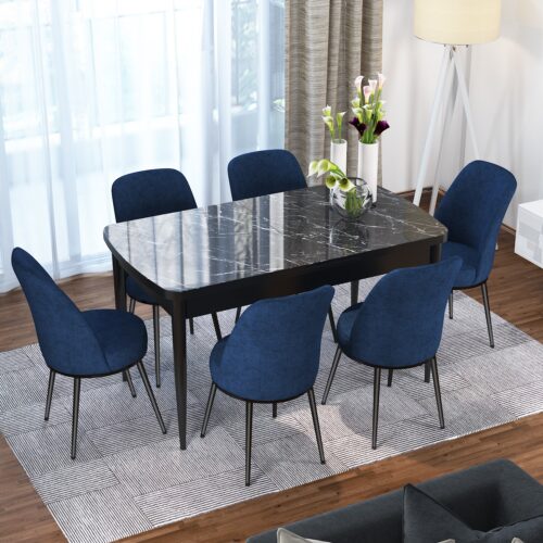 Are Serisi 80 x 132 cm Açılabilir Mdf Beyaz Mermer Desen Masa Takımı 6 Sandalye Gümüş Halkalı