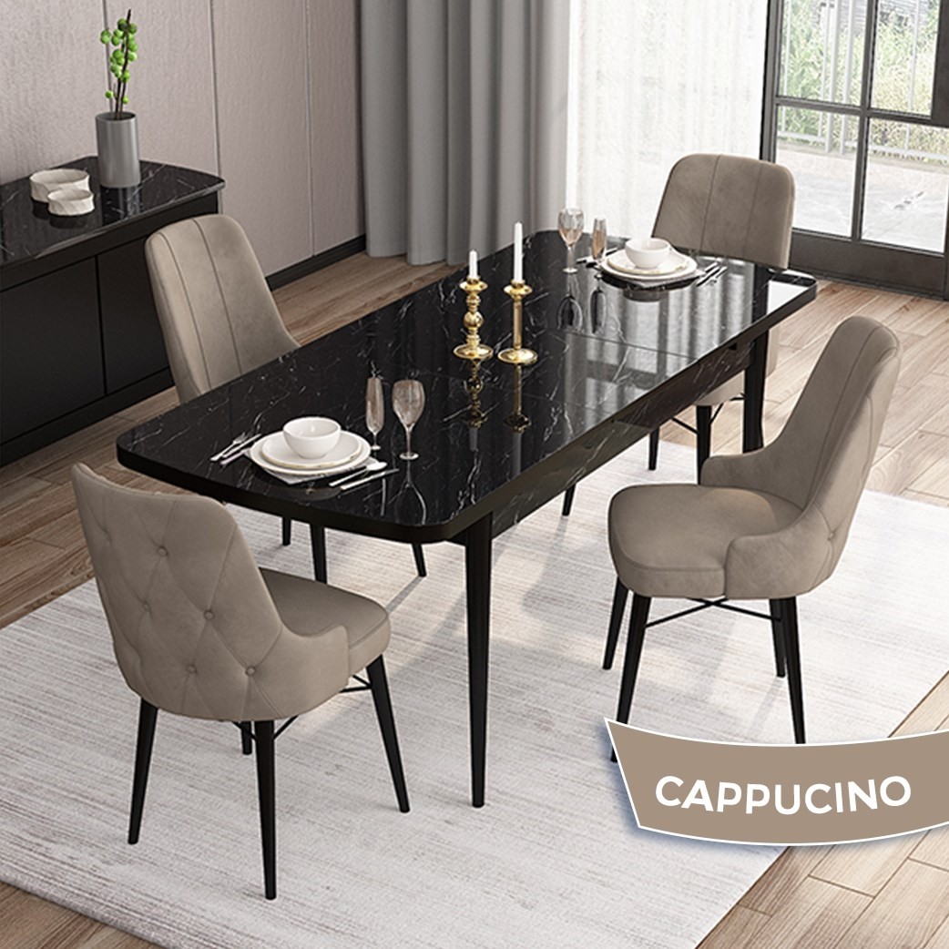 PAKET İÇERİĞİ: AÇILABİLİR MDF SİYAH MERMER DESEN MASA +4 ADET ARAZ SANDALYE