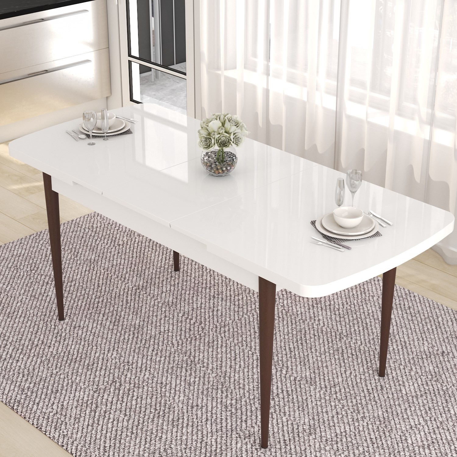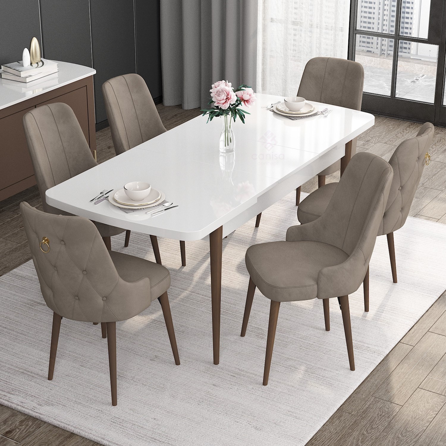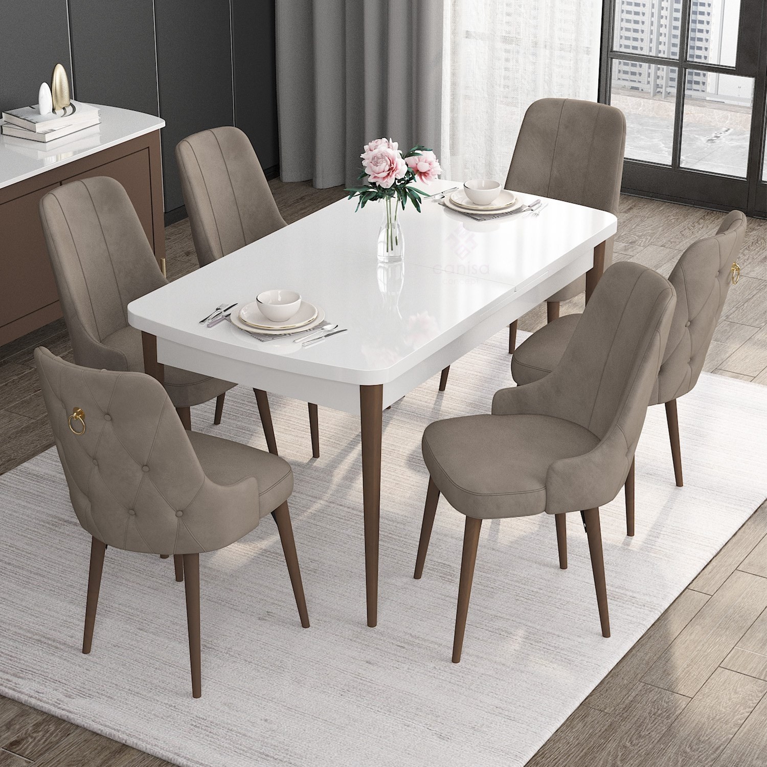 - PAKET İÇERİĞİ: BEYAZ MASA CEVİZ AYAK AÇILABİLİR MASA +6 ADET ENOA SANDALYE