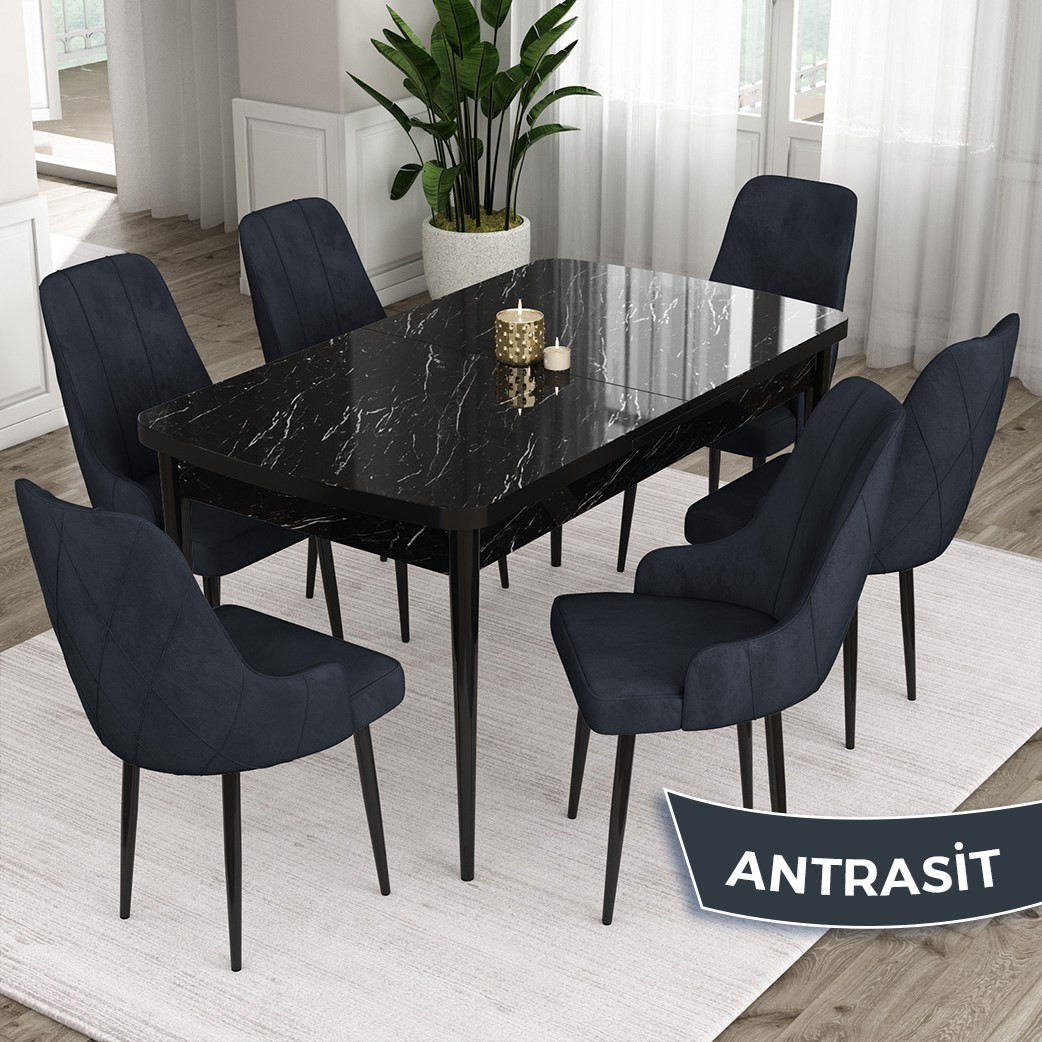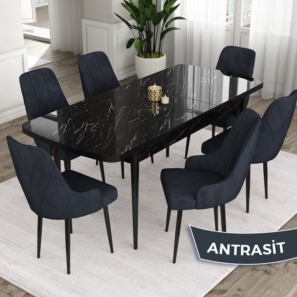 PAKET İÇERİĞİ: SİYAH MERMER DESEN AÇILABİLİR MASA +6 ADET TREX SANDALYE