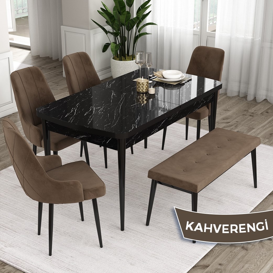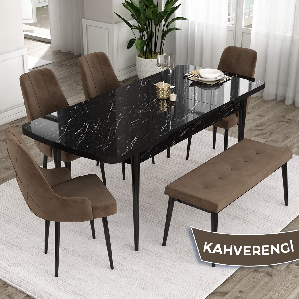 PAKET İÇERİĞİ: SİYAH MERMER DESEN AÇILABİLİR MASA +4 ADET TREX SANDALYE+ 1 ARWEN BENCH