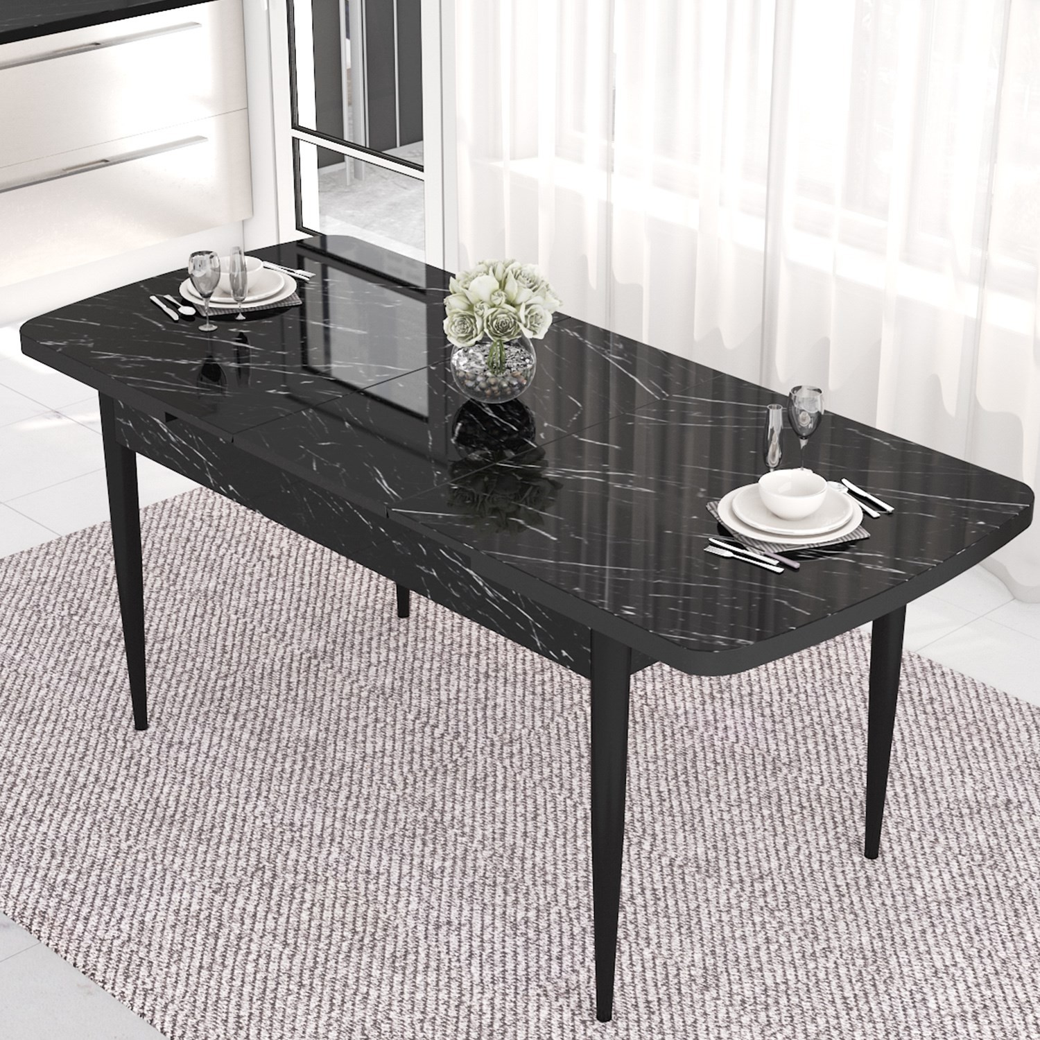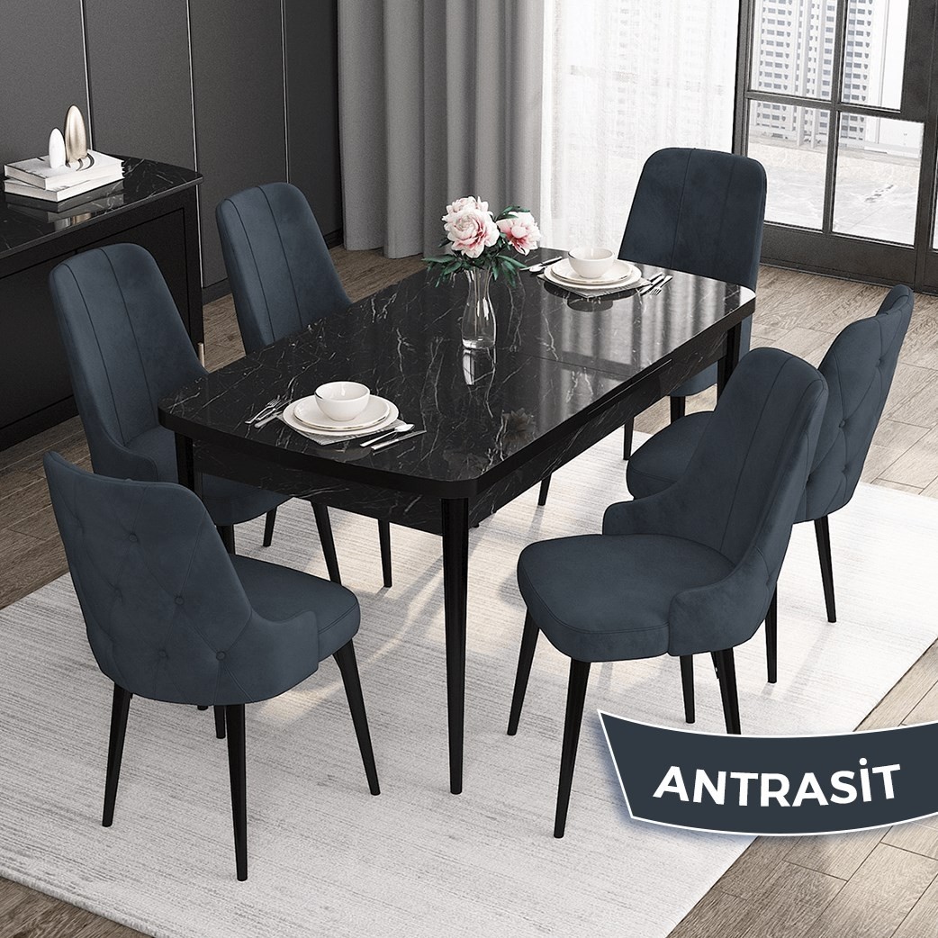 ROY SERİSİ SİYAH MERMER DESEN AÇILABİLİR MUTFAK MASASI VE SANDALYE TAKIMI