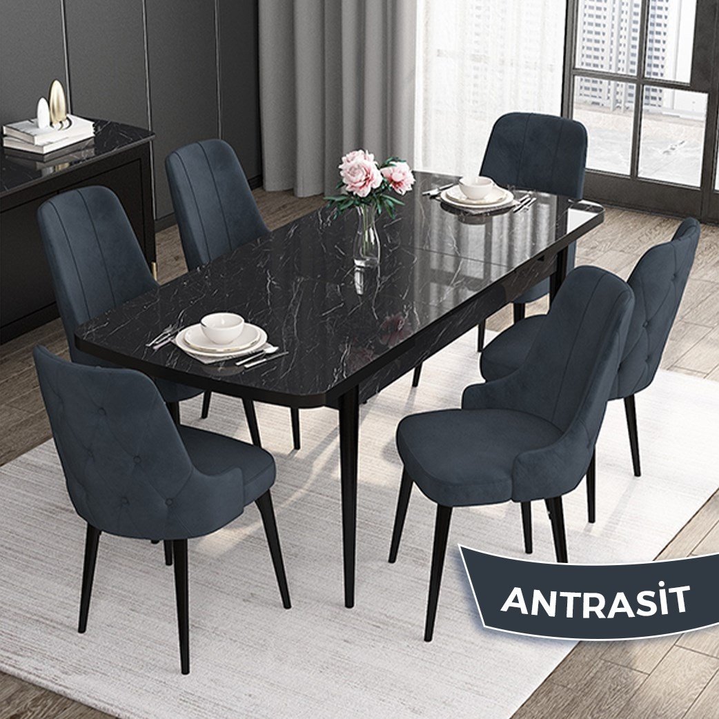 PAKET İÇERİĞİ: SİYAH MERMER DESEN MDF AÇILABİLİR MASA +6 ADET MAYA SANDALYE