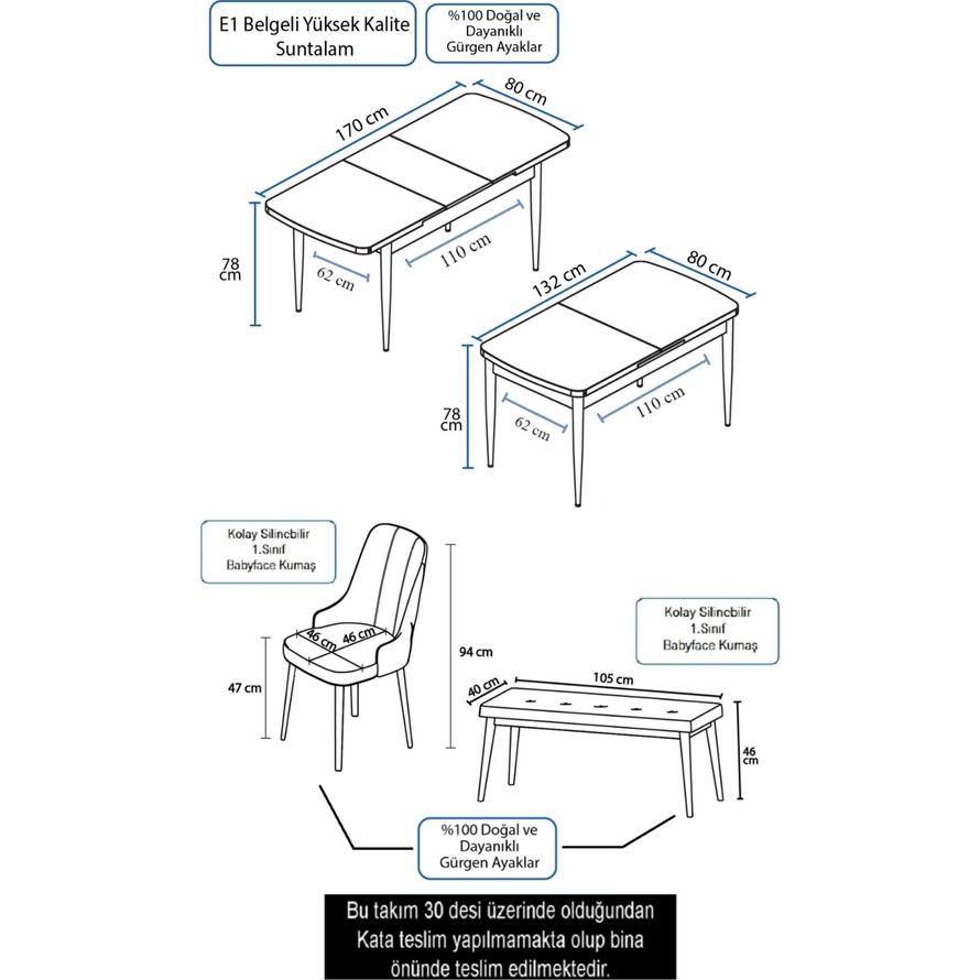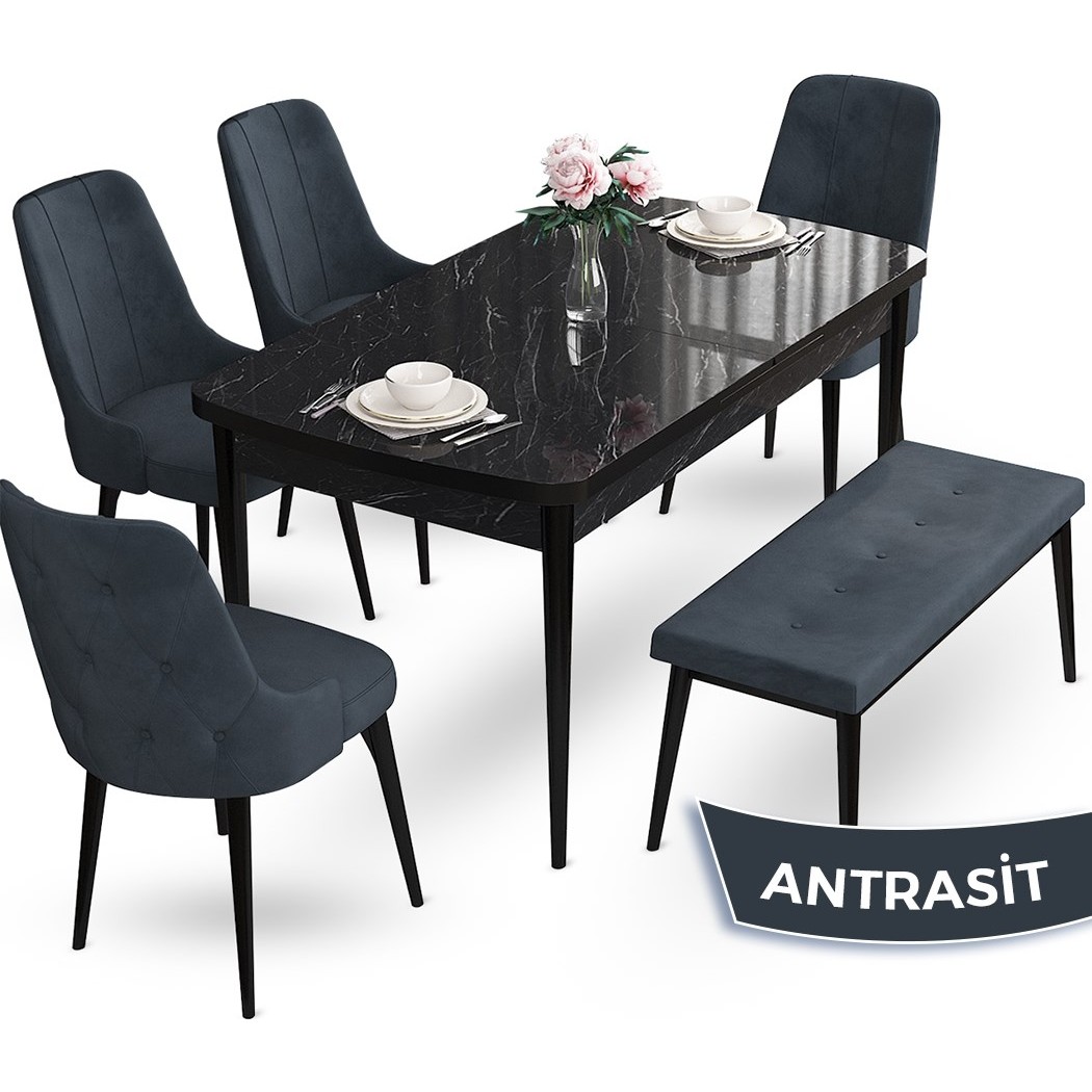 PAKET İÇERİĞİ: SİYAH MERMER DESEN AÇILABİLİR MASA +4 ADET MAYA SANDALYE + 1 ARWEN BENCH