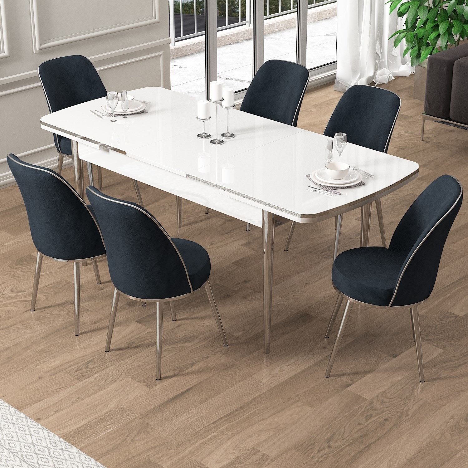 PAKET İÇERİĞİ: BEYAZ 80×132 AÇILABİLİR MASA +6 ADET PEFA SANDALYE (KROM DETAY)