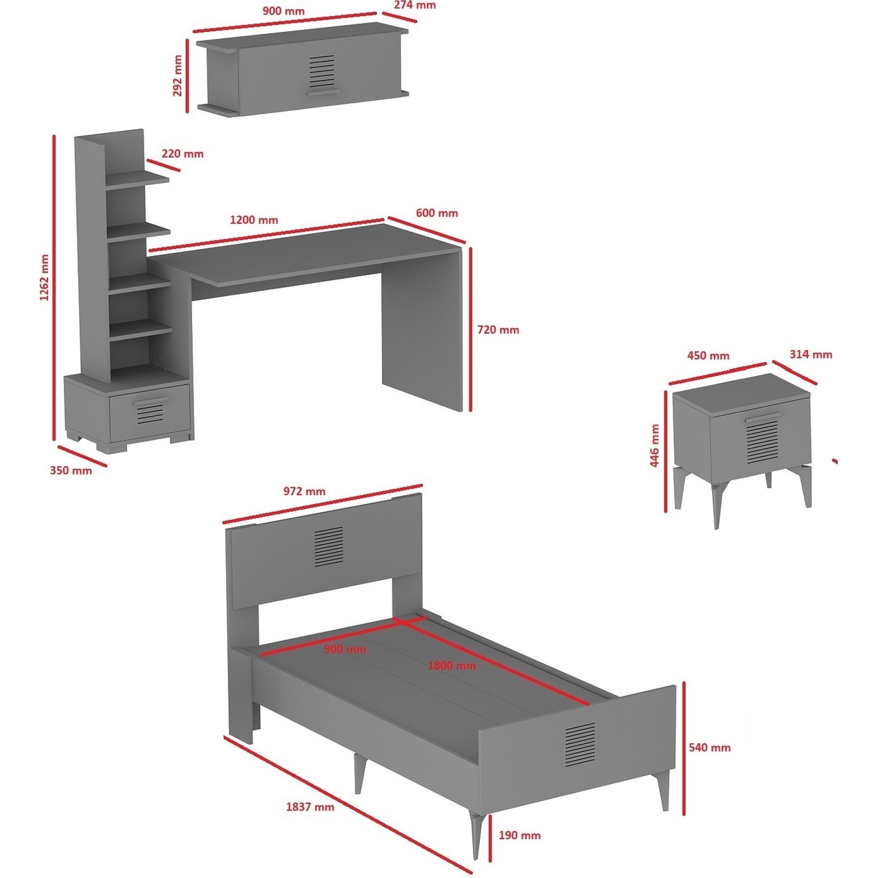 Asimo Çocuk Genç Odası Takımı (P-T-L-G) :  Tek kişilik karyola Başlık yükseklik 90 cm x Genişlik 97 cm x Derinlik 180 cm ölçüsündeki tek kişilik yataklara uygundur, ürün içerinde yatak hariçtir.  Asimo Komidin ÖLçüler ; Genişlik: 45 CM x Yükseklik: 49 CM X Derinlik: 31.4 . Asimo kitaplık: Genişlik 31,4cm x Derinlik 35cm x yükseklik 126,2cm Çalışma masası: Genişlik 120cm x Derinlik 60cm x Yükseklik 72 cm. Detaylı Ürün ölçüleri görselde belirtilmiştir, Lütfen görselden inceleyiniz, açıklamaları dikkatli okuyunuz ürünümüzü tercih etmeden önce lütfen ölçülerine dikkat ediniz. Ürün ayakları sağlam plastik malzemeden üretilmiştir. Ürün görsellerinde görüntülediğiniz cihaz ışığından kaynaklı ürün renklerinde ton farklılıkları olabilmektedir. Malzeme : 18 mm kalınlığında suntalam malzeme kullanılarak üretilmiştir. Ürün nemli bez ile kolayca silinebilir. Ürünlerimiz demonte olarak gönderilmekte olup kurulum siz değerli müşterimize aittir. Kurulumu kolayca yapabilmeniz için ihtiyacınız olan tüm parçalar kurulum şeması ile birlikte gönderilmektedir. Paketin içerisinden çıkan kurulum şeması ile ürününüzü keyifle kullanıma hazırlayabilirsiniz. Satış Sonrası : Ürünü teslim aldıktan sonra hasarlı parçalar var ise parça üzerinde yazan numarayı veya parça ölçülerini, eksik parçalar var ise kurulum şemasından eksik parça numarasını belirleyip müşteri temsilcimize ilettiğinizde hasarlı parçalar şekilde tarafınıza gönderilmektedir Montajı gerçekleştirilmiş ürünlerin iadesi yapılmamaktadır.