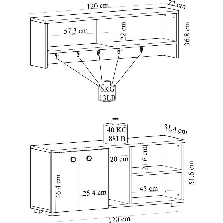 Askılık ölçüleri : genişlik: 120 cm – derinlik: 22 cm – yükseklik: 36,8 cm