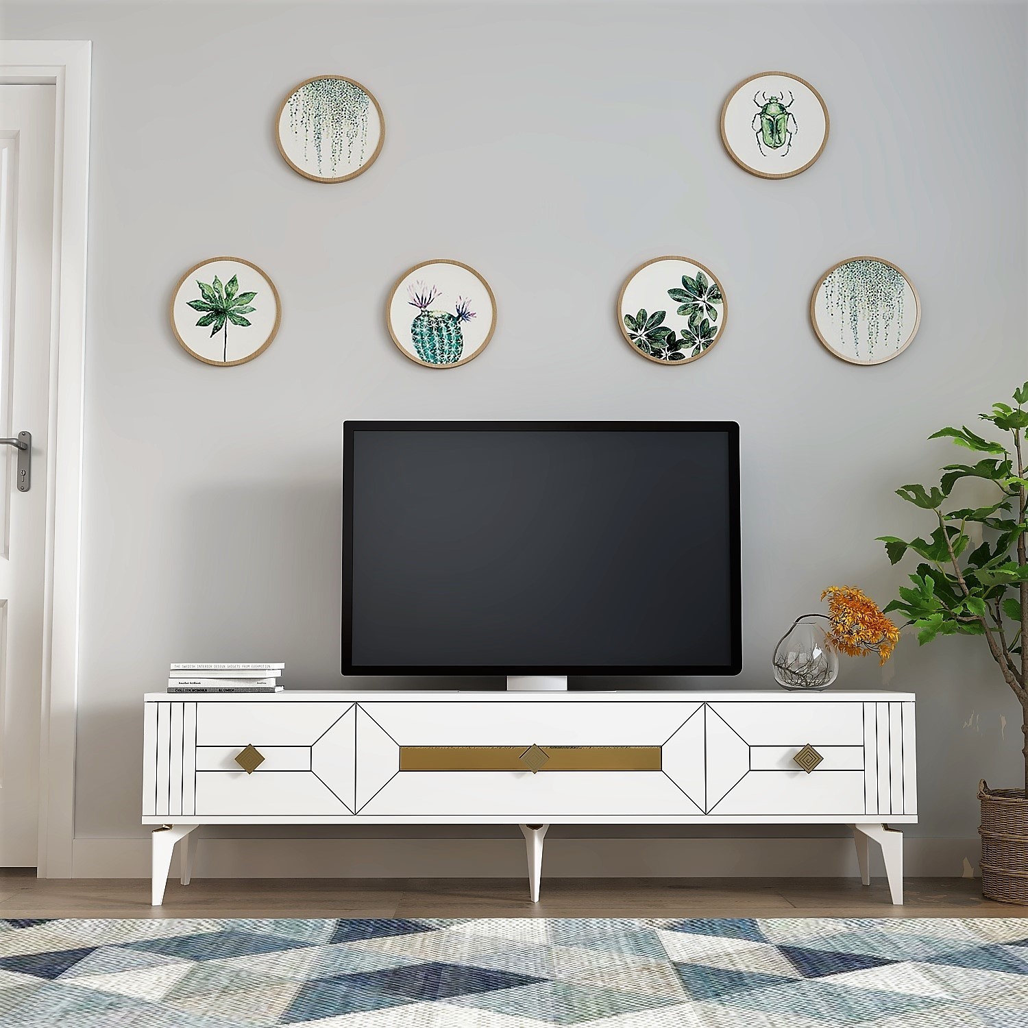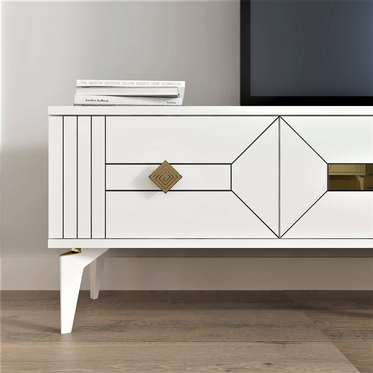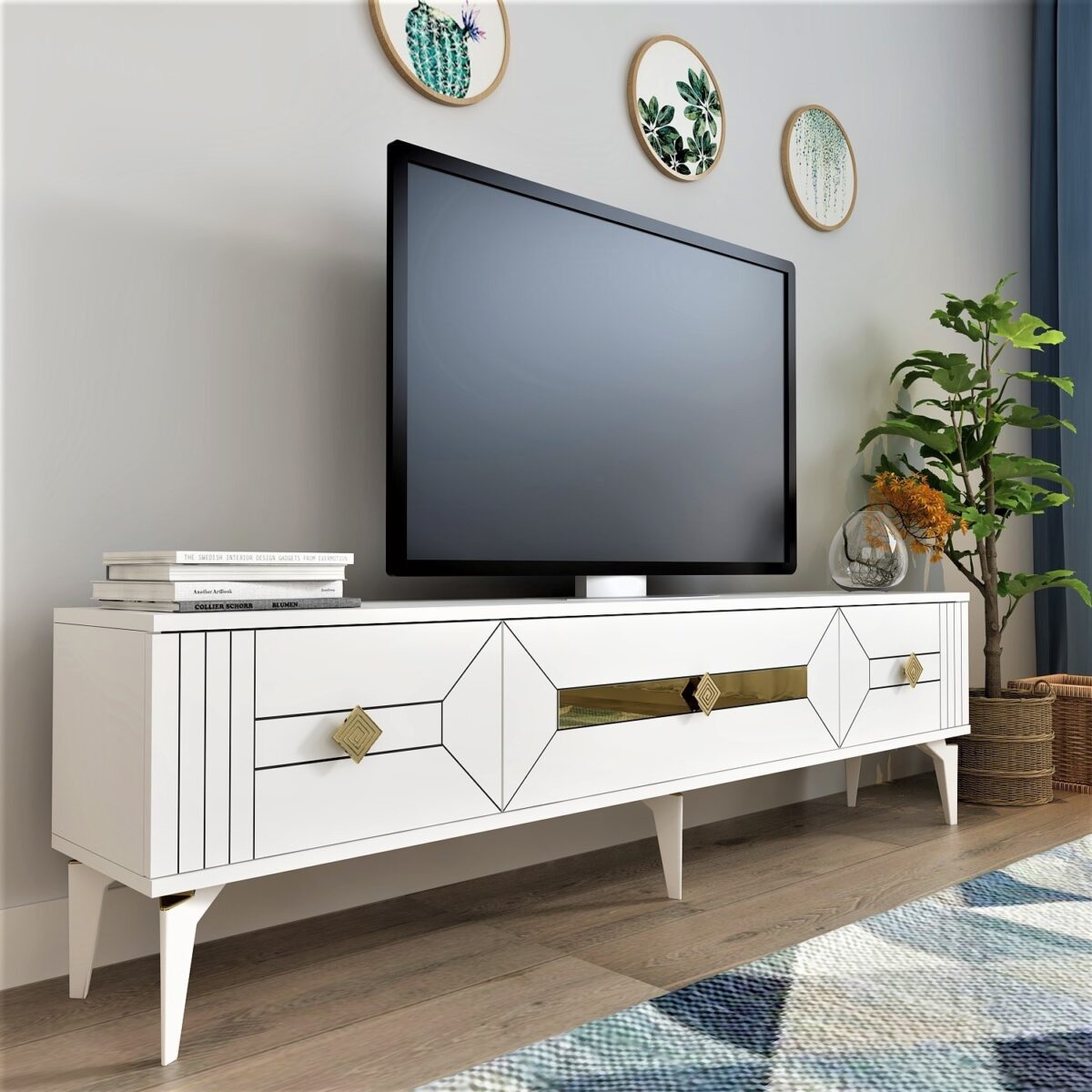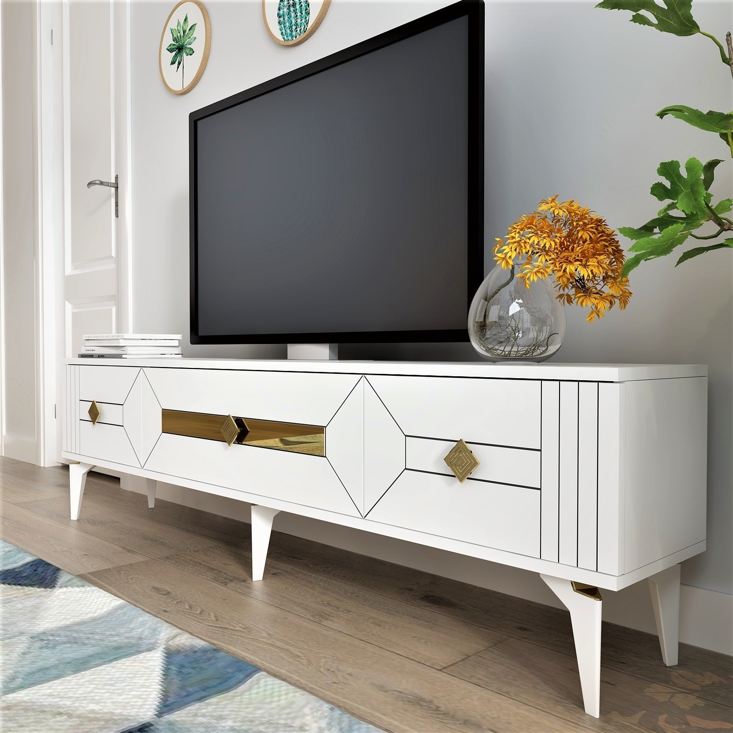 Demonte Dekor 3 Kapaklı, Şık, Kullanışlı Ceneyra Tv Ünitesi Beyaz-Altın