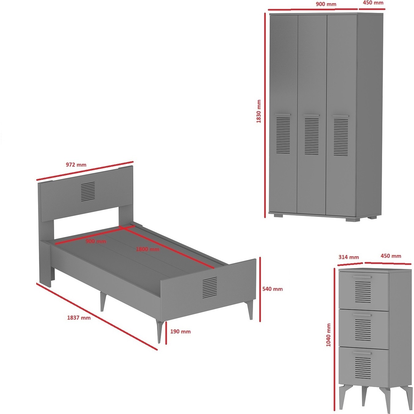 Asimo Çocuk Genç Odası Takımı (H-L-C) : Tek Kişilik Karyola Ölçüleri : Başlık yükseklik 90 cm x Genişlik 97 cm x Derinlik 180 cm ölçüsündeki tek kişilik yataklara uygundur, ürün içerinde yatak hariçtir. Asimo Şifonyer ÖLçüler ; Genişlik: 45 CM x Yükseklik: 104 CM X Derinlik: 31.4 . Gardırop Ölçüleri : Genişlik 90cm x derinlik 45 cm x Yükseklik 183cm. Detaylı Ürün ölçüleri görselde belirtilmiştir, Lütfen görselden inceleyiniz, açıklamaları dikkatli okuyunuz ürünümüzü tercih etmeden önce lütfen ölçülerine dikkat ediniz. Ürün ayakları sağlam plastik malzemeden üretilmiştir. Ürün görsellerinde görüntülediğiniz cihaz ışığından kaynaklı ürün renklerinde ton farklılıkları olabilmektedir. Malzeme : 18 mm kalınlığında suntalam malzeme kullanılarak üretilmiştir. Ürün nemli bez ile kolayca silinebilir. Ürünlerimiz demonte olarak gönderilmekte olup kurulum siz değerli müşterimize aittir. Kurulumu kolayca yapabilmeniz için ihtiyacınız olan tüm parçalar kurulum şeması ile birlikte gönderilmektedir. Paketin içerisinden çıkan kurulum şeması ile ürününüzü keyifle kullanıma hazırlayabilirsiniz. Satış Sonrası : Ürünü teslim aldıktan sonra hasarlı parçalar var ise parça üzerinde yazan numarayı veya parça ölçülerini, eksik parçalar var ise kurulum şemasından eksik parça numarasını belirleyip müşteri temsilcimize ilettiğinizde hasarlı parçalar şekilde tarafınıza gönderilmektedir Montajı gerçekleştirilmiş ürünlerin iadesi yapılmamaktadır.