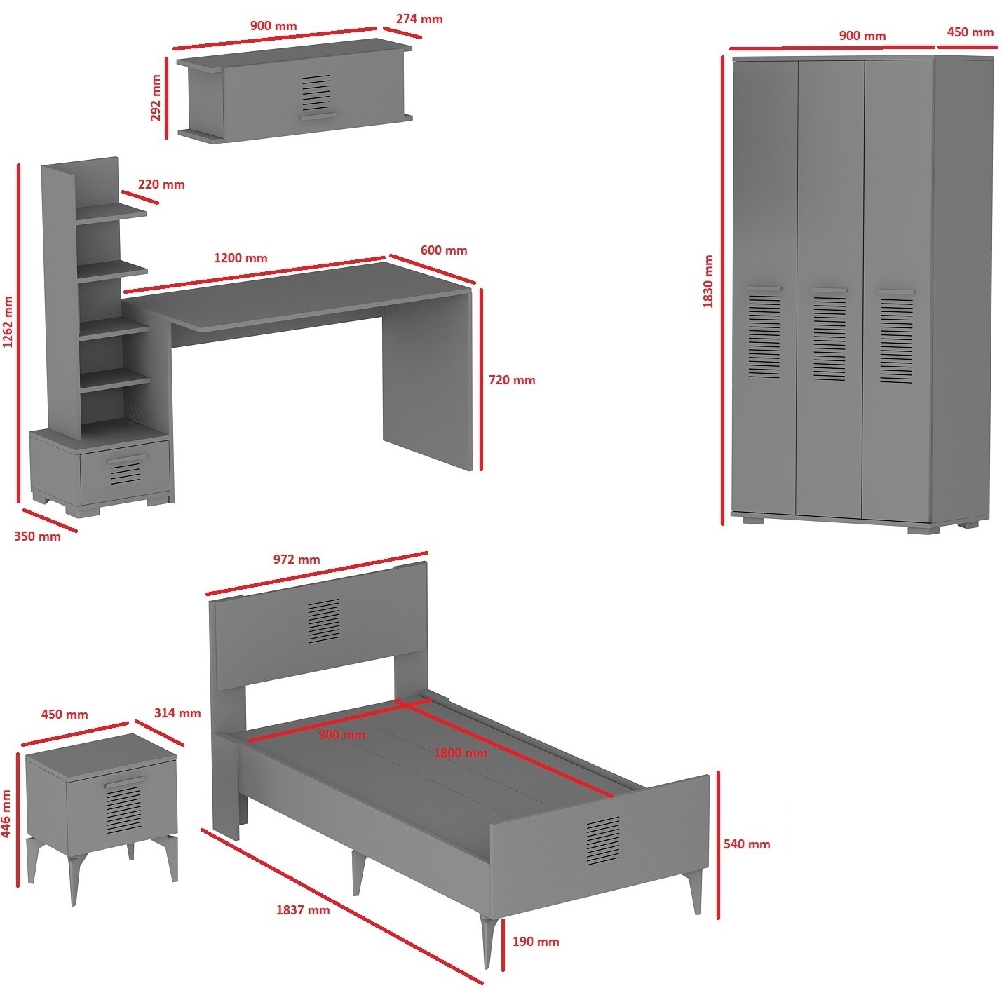 Asimo Çocuk Genç Odası Takımı (P-R-L-C-G) : Tek kişilik karyola Başlık yükseklik 90 cm x Genişlik 97 cm x Derinlik 180 cm ölçüsündeki tek kişilik yataklara uygundur, ürün içerinde yatak hariçtir. 3 kapaklı Gardırop : Genişlik 90cm x derinlik 45 cm x Yükseklik 183cm. Asimo Komidin ÖLçüler ; Genişlik: 45 CM x Yükseklik: 49 CM X Derinlik: 31.4 . Asimo kitaplık: Genişlik 31,4cm x Derinlik 35cm x yükseklik 126,2cm Çalışma masası: Genişlik 120cm x Derinlik 60cm x Yükseklik 72cm. Detaylı Ürün ölçüleri görselde belirtilmiştir, Lütfen görselden inceleyiniz. Ürün görsellerinde görüntülediğiniz cihaz ışığından kaynaklı ürün renklerinde ton farklılıkları olabilmektedir. Malzeme : 18 mm kalınlığında suntalam malzeme kullanılarak üretilmiştir. Ürün nemli bez ile kolayca silinebilir. Ürünlerimiz demonte olarak gönderilmekte olup siz değerli müşterimize aittir. u kolayca yapabilmeniz için ihtiyacınız olan tüm parçalar şeması ile birlikte gönderilmektedir. Paketin içerisinden çıkan şeması ile ürününüzü keyifle kullanıma hazırlayabilirsiniz. Satış Sonrası : Ürünü teslim aldıktan sonra hasarlı parçalar var ise parça üzerinde yazan numarayı veya parça ölçülerini, eksik parçalar var ise şemasından eksik parça numarasını belirleyip müşteri temsilcimize ilettiğinizde hasarlı parçalar şekilde tarafınıza gönderilmektedir Montajı gerçekleştirilmiş ürünlerin iadesi yapılmamaktadır.