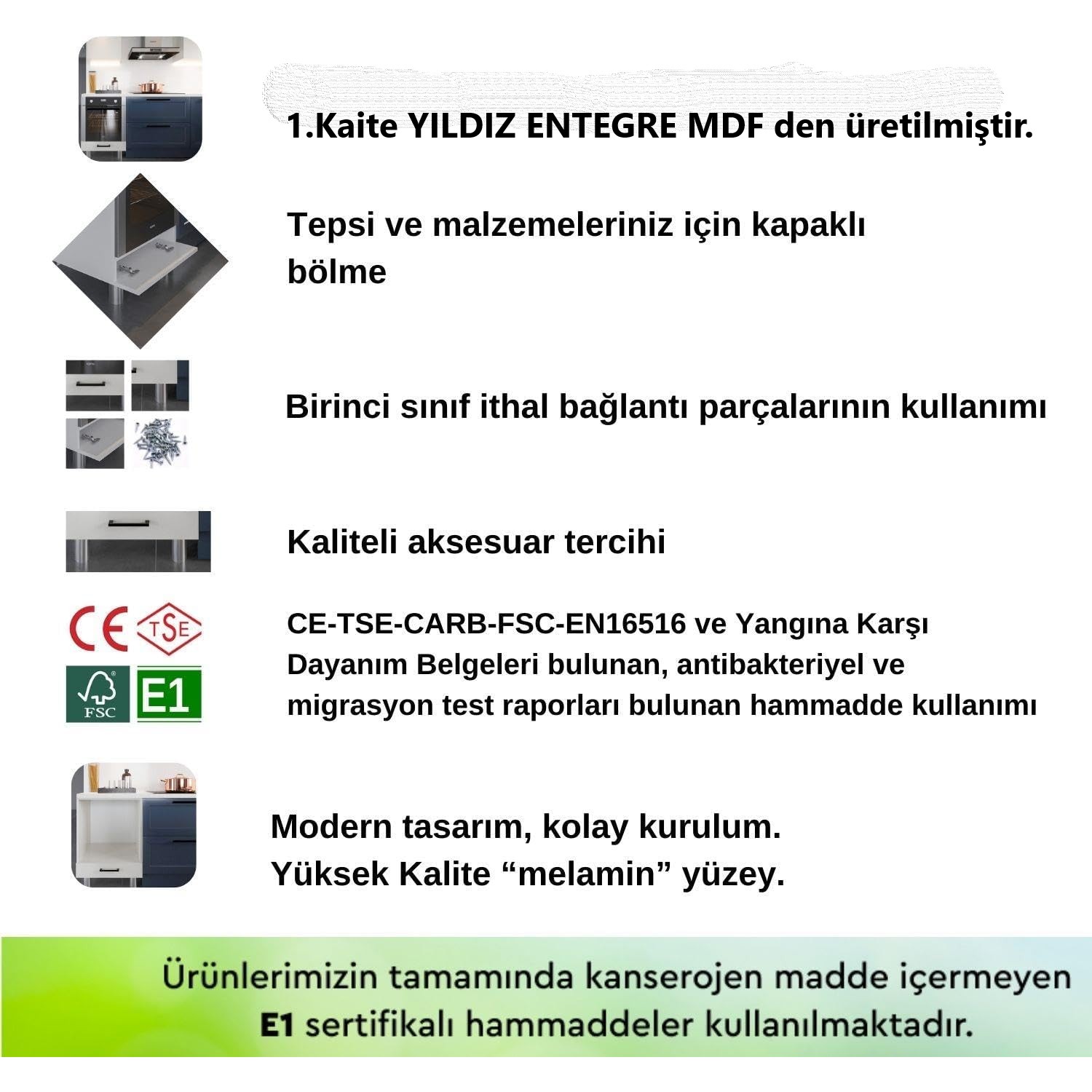 Ürün gerçekten çok sağlam , MDF malzeme kalitesi ve ağırlığı güven veriyor. Kurulum biraz zaman alsa da sonuçta taş gibi, uzun ömürlü duruyor. Sadece küçük bir önerim olacak: Ankastre fırının oturacağı üst levhada vida yerleri işaretli olursa kurulum çok daha pratik hale gelir. Onun dışında her şey dört dörtlük, teşekkür ederim.