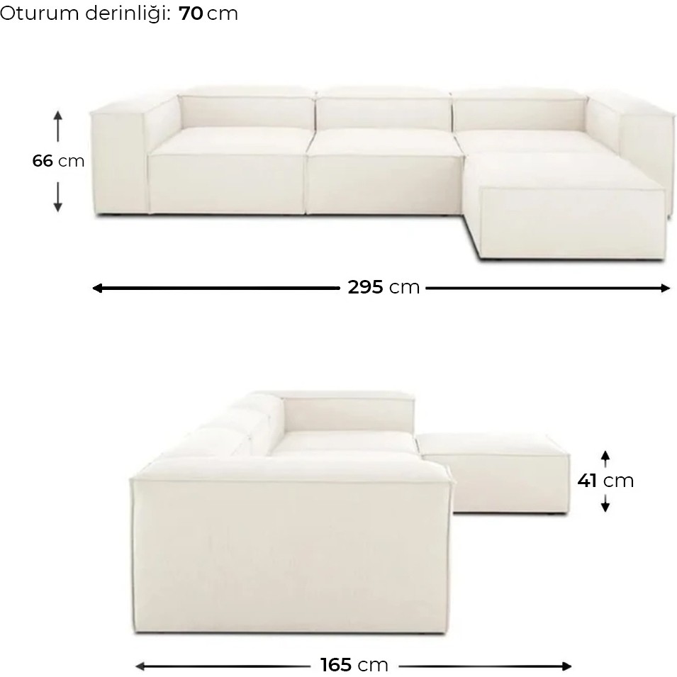 Edsy Home Mira Relax 4 Modül Köşe Koltuk ( Krem ) Keten Kumaş Ürün silinebilir ve leke tutmaz BABYFACE KADİFE kumaştır. ÜRÜNÜMÜZÜN YANINDA KENDİ RENGİNDEN OLMAK ÜZERE 6 ADET KIRLENT HEDİYEMİZDİR. Ürün toplam 4 parça ( 2 adet kollu modül 1 adet orta modül 1 adet puftan oluşmaktadır ) ; Ürün altında bulunan kilit mekanizması ile modülleri birbirine kolaylıkla sabitleyebilirsiniz ve modüllerin yerlerini değiştirerek istediğiniz şekilde kombinleyebilirsiniz. Oturumunda 1. soft 30 dns sünger kullanılmıştır. turum bölümü oldukça yumuşaktır, oturup kalktığınızda süngeri eski haline geri döner TEMİZLİK VE BAKIM: hazırladığınız deterjanlı su ile temizleyerek sonrasında kuru bir bez ile temizleyebilirsiniz Kırlentleri fermuarlıdır isteğe göre makinada yıkanabilir. Genişlik 295 cm Oturum Yüksekliği 41 cm Yükseklik 66 cm Oturum Derinliği 70 cm