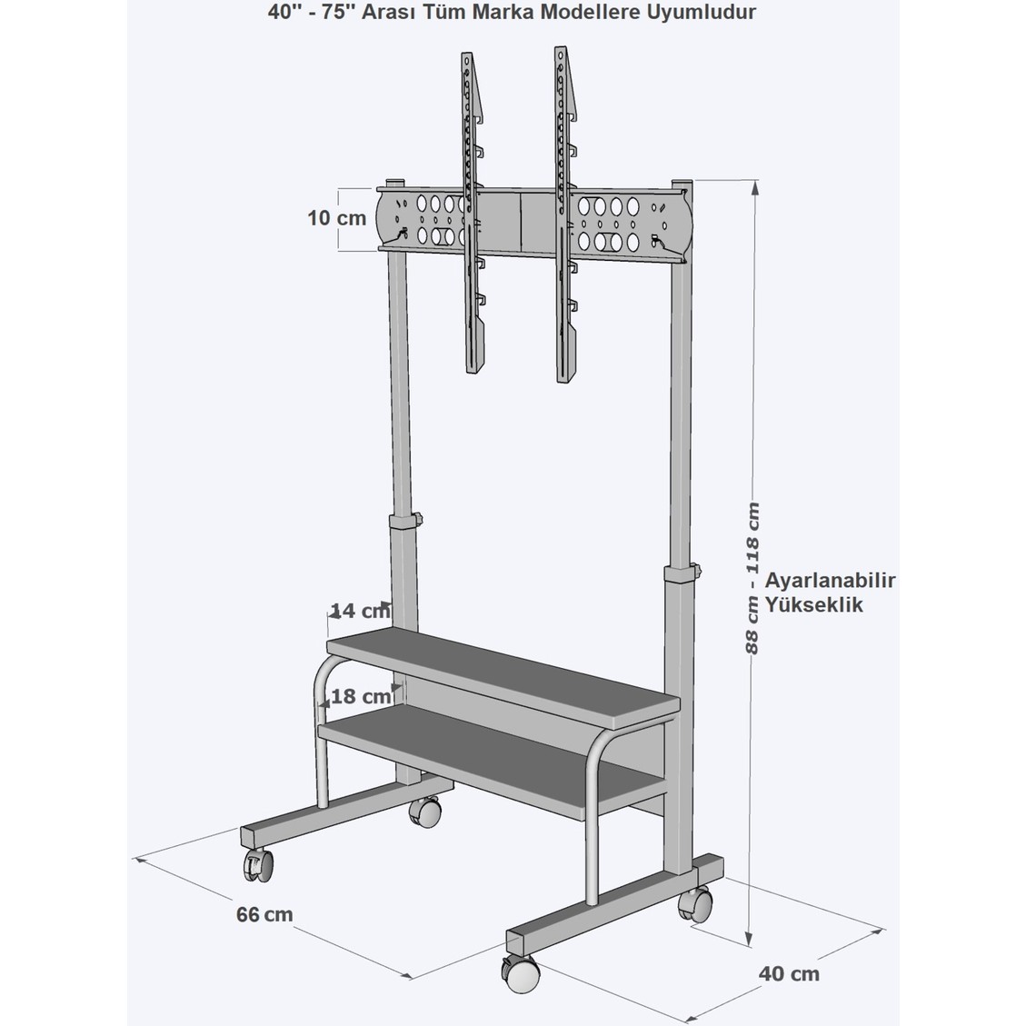 hareketli mobil tv standı metal iskeleti kalın profillerden oluşmakta olup çizilmelere karşı dayanıklı elektrostatik fırın boya ile boyanmıştır.