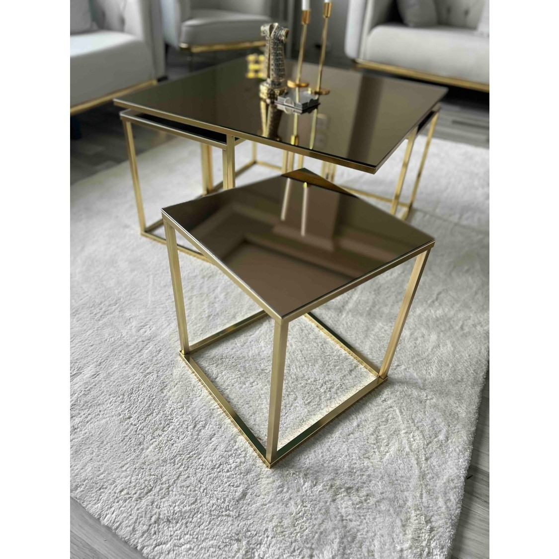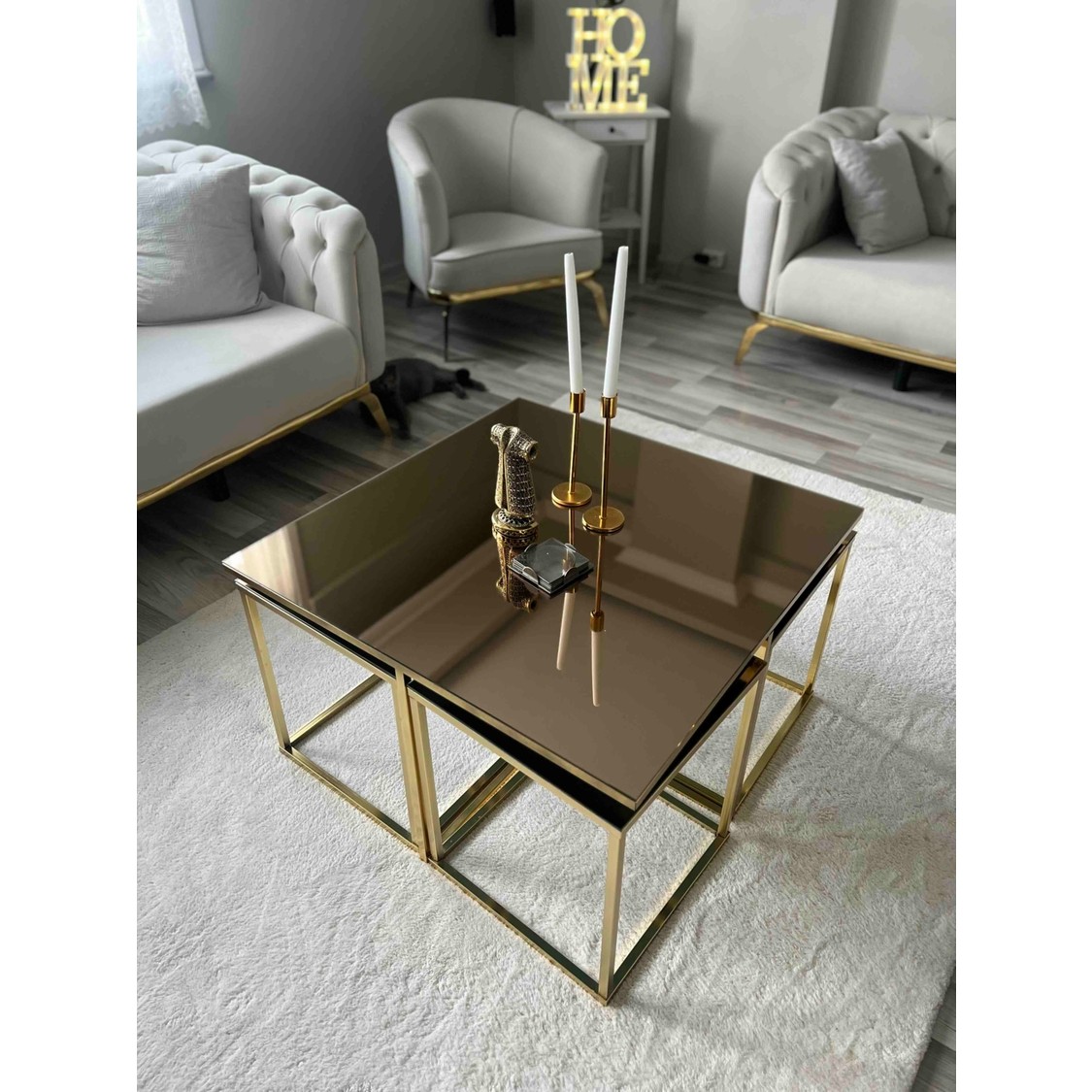 Home Plus Mobilya 4+1 Gold Kaplama Bronz Ayna Orta Sehpa