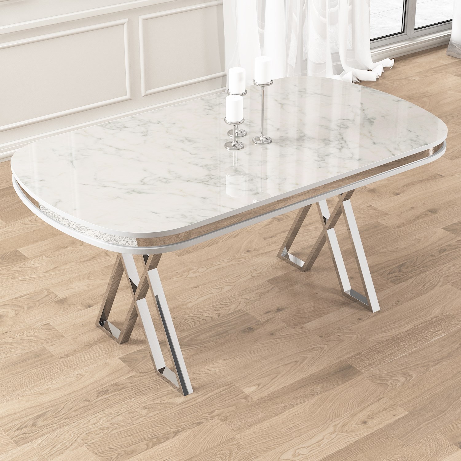 Lai Serisi 90X168 Lak Panel Beyaz Mermer Desen Krom Ayak Masa Takımı 6 Sandalye