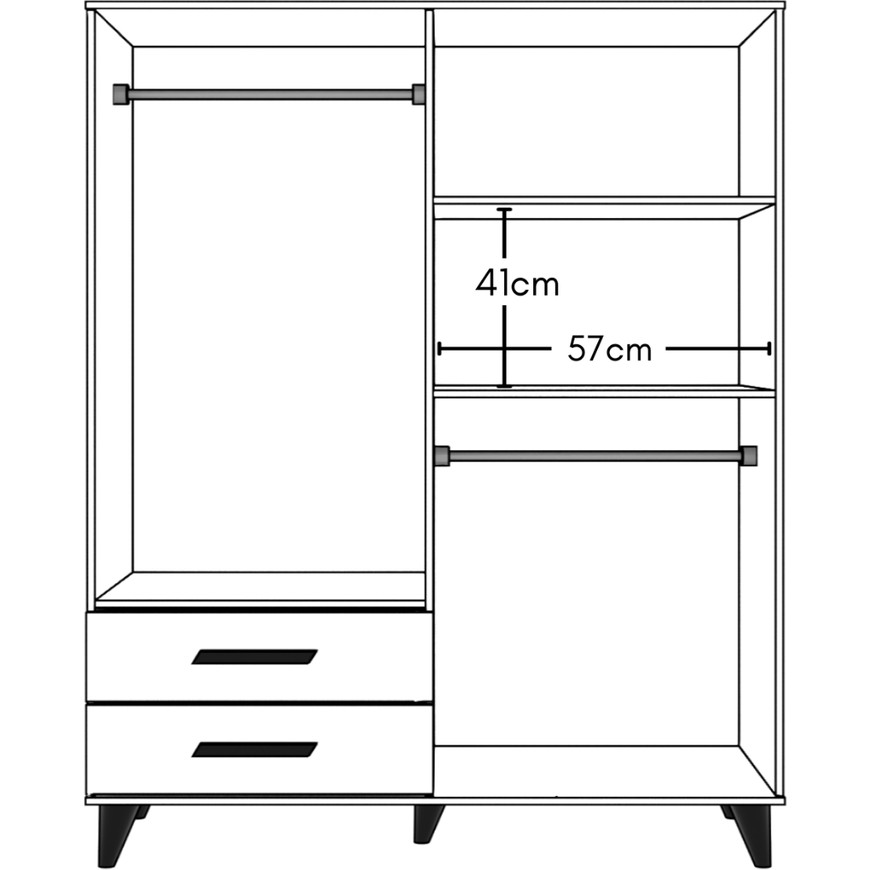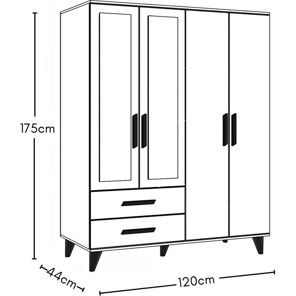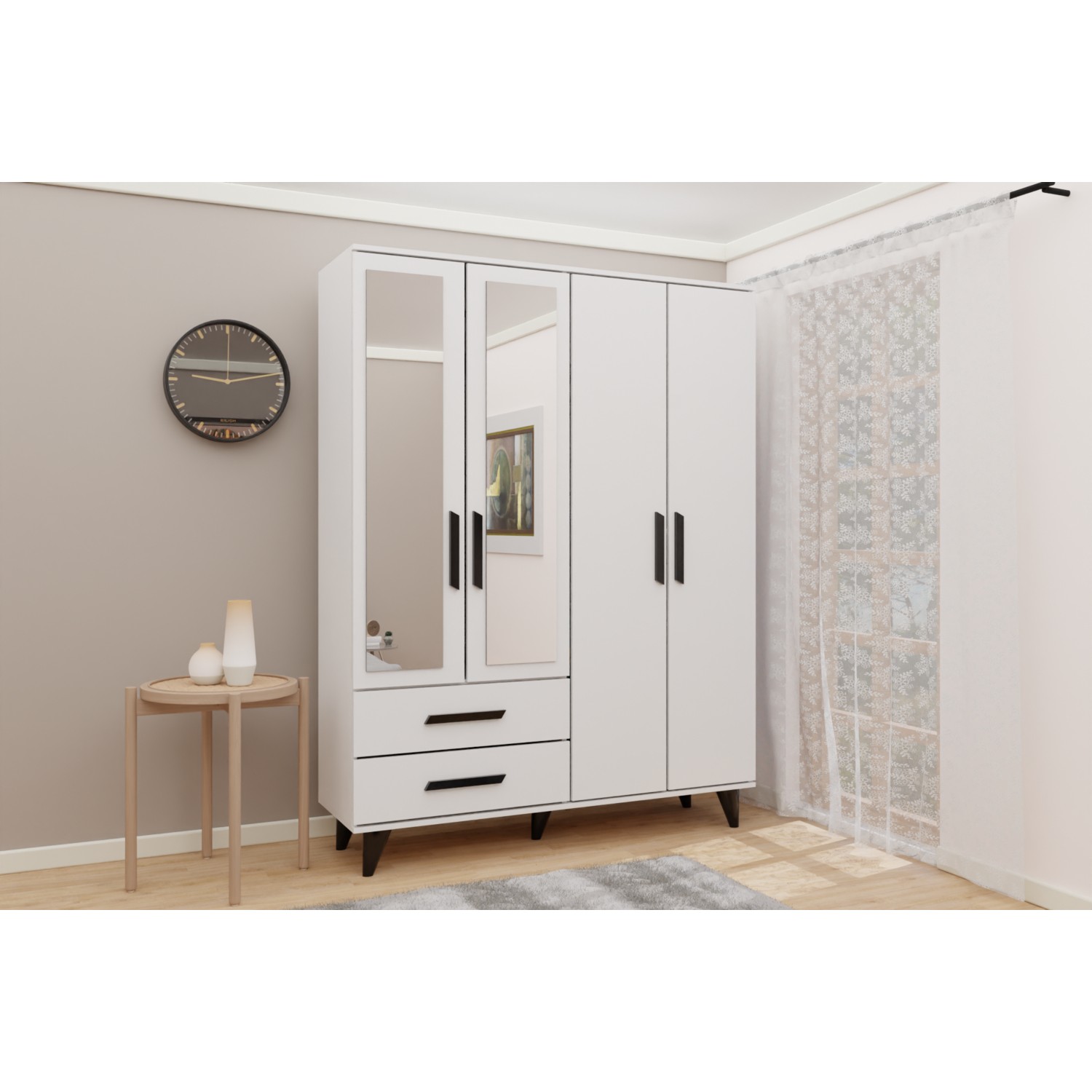 Geniş iç hacmi sayesinde kıyafetlerinizi ve aksesuarlarınızı rahatça yerleştirebilirsiniz. İki adet askı bölmesi, dört kapılı yapısı ve üç rafı ile eşyalarınızı düzenli bir şekilde saklamanıza olanak tanır. Ayrıca, iki çekmecesi sayesinde küçük eşyalarınızı da kolayca muhafaza edebilirsiniz.