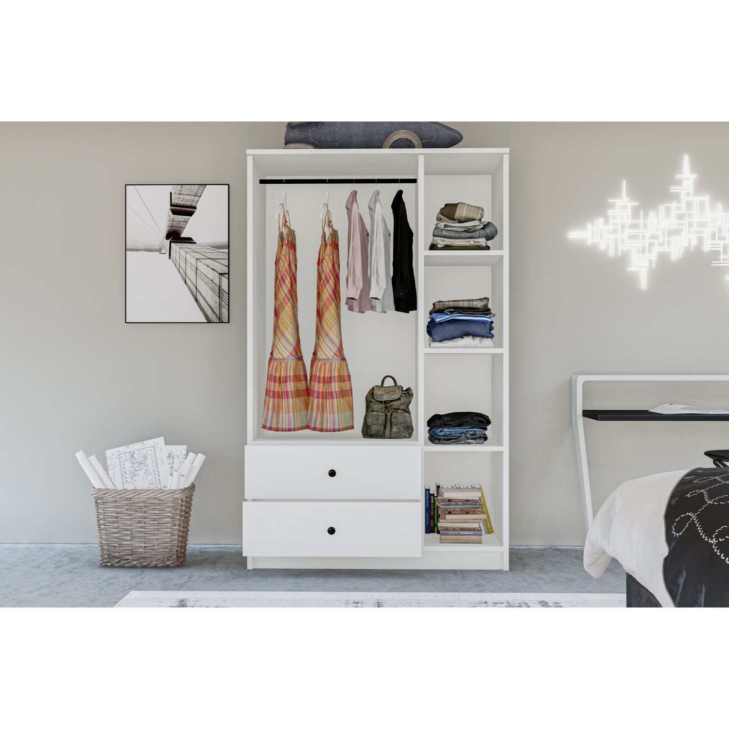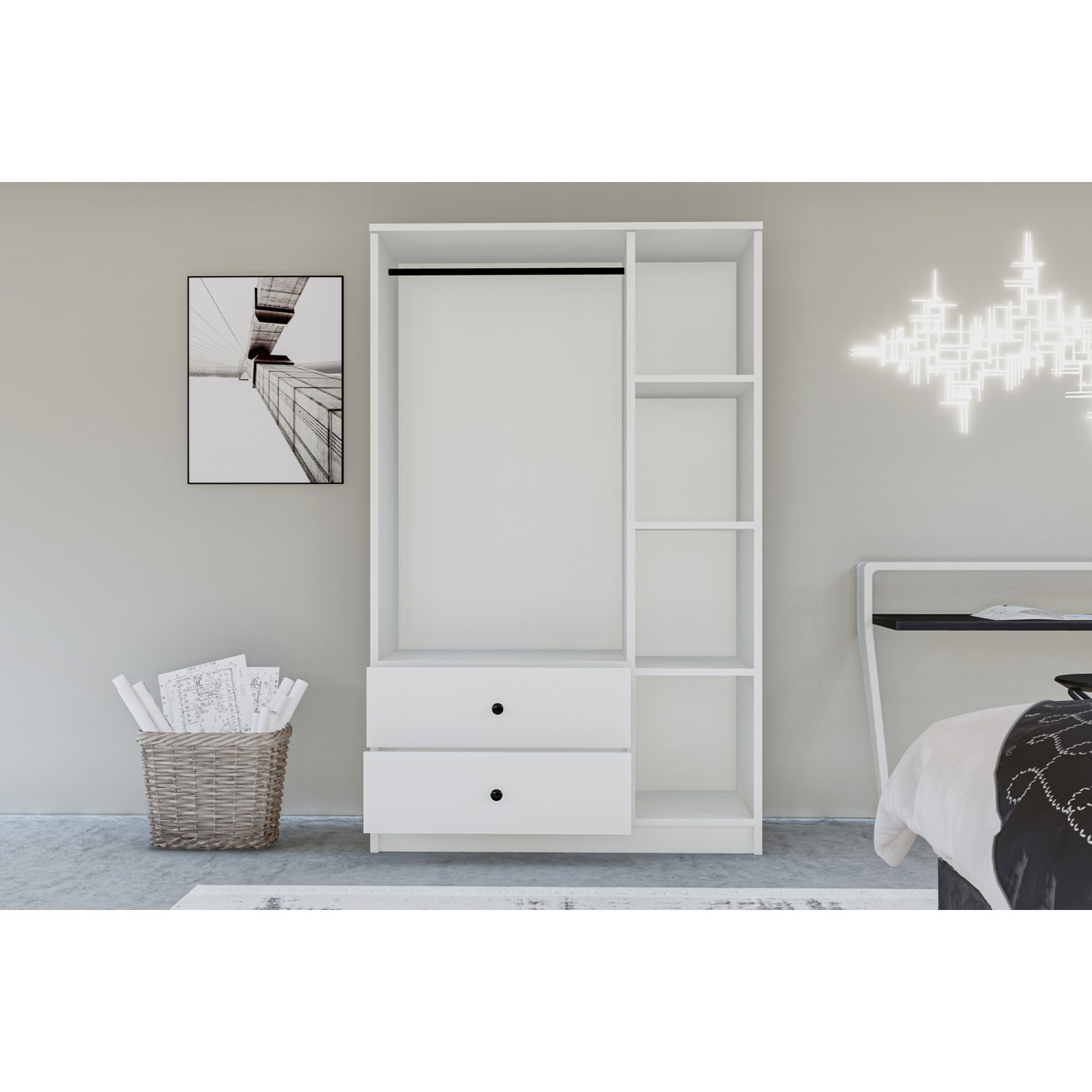 Suntalam malzemeden üretilmiş gövde ve kapakları, dayanıklılığı ve uzun ömürlü kullanımı garantiler. İki çekmecesi, küçük eşyalarınızı düzenli bir şekilde saklamanıza olanak tanır. Askı bölmesi ve rafları sayesinde, kıyafetlerinizi kırışmadan saklayabilir, düzenli bir dolap deneyimi yaşayabilirsiniz. Modern tasarımı, her türlü dekorasyon tarzına uyum sağlar ve odanıza ferahlık katar.