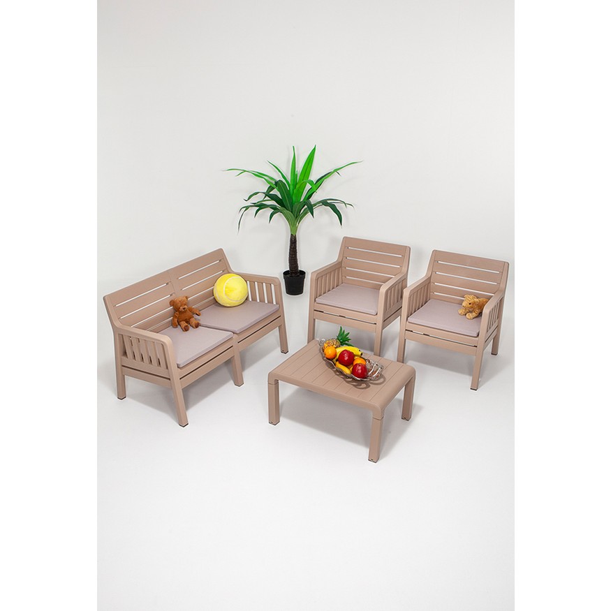 - Lara bahçe – balkon – teras oturma grubu 1 adet ikili minderli koltuk + 2 adet tekli minderli koltuk + 1 adet orta sehpadan oluşmaktadır.