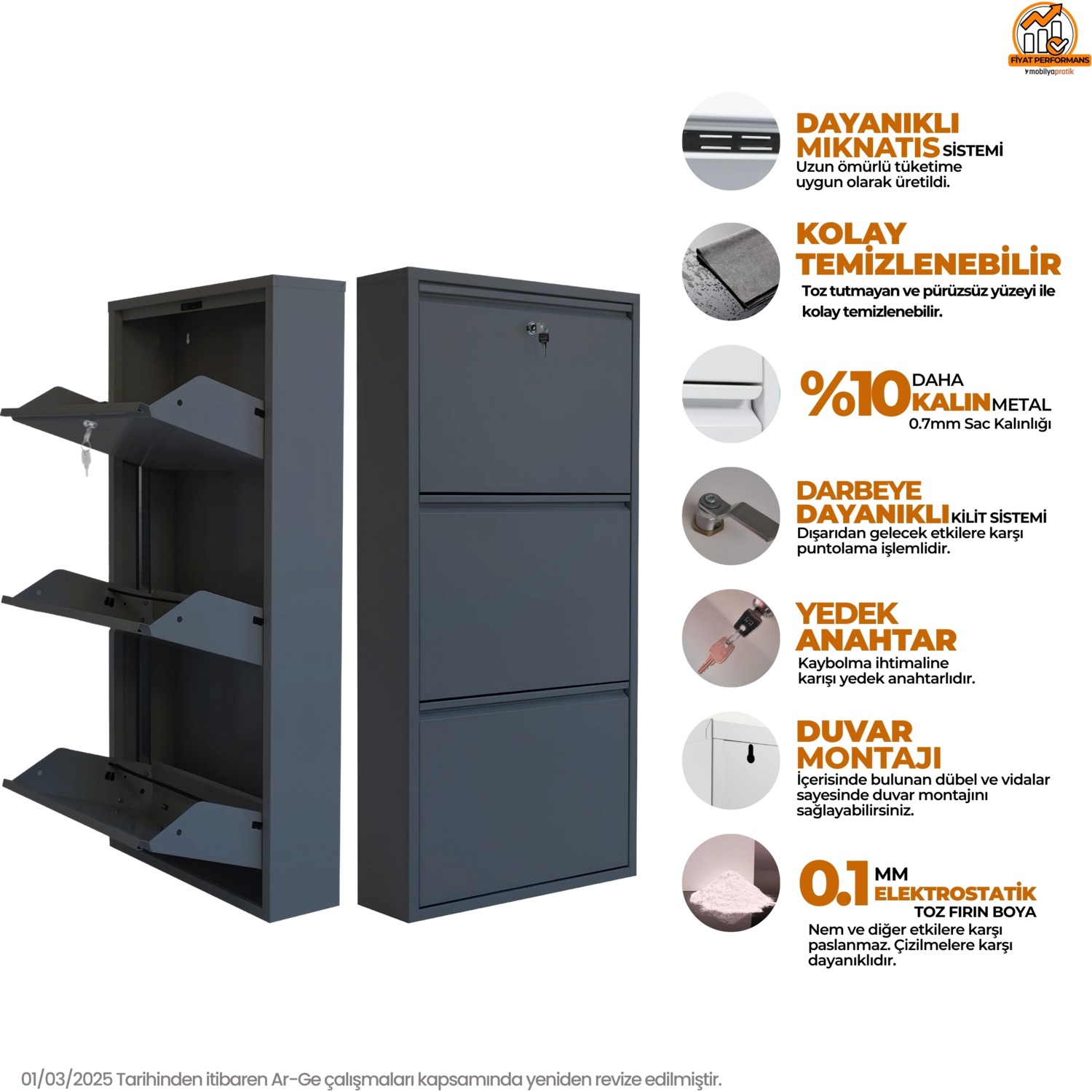 Mobilya Pratik Kilitli 3’lü Metal Ayakkabılık, şık tasarımı, sağlam metal gövdesi ve güvenli kilit sistemi ile evinizin en düzenli köşesi olmaya adaydır. Dar alanlara uygun kompakt yapısı sayesinde antre, koridor ve ofislerde yerden tasarruf ederek ayakkabılarınızı düzenli tutar. ✨
