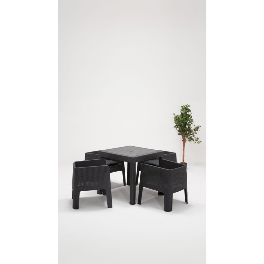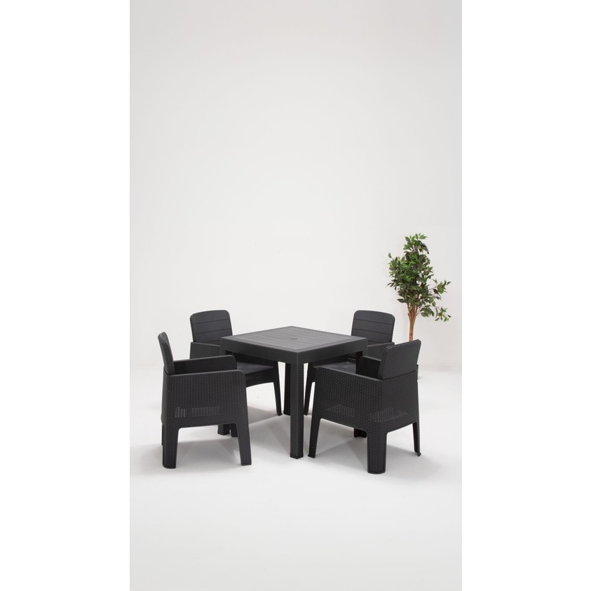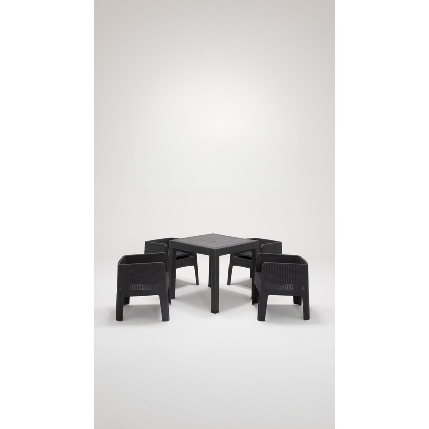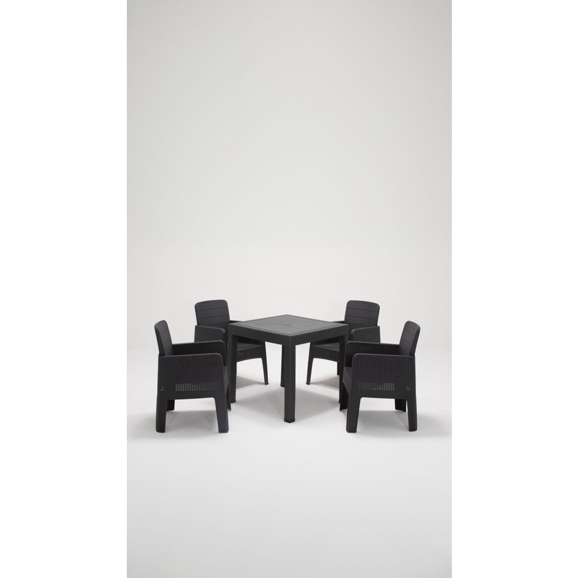 – dayanıklı plastik malzeme kullanımı sayesinde uzun ömürlü ve kolay temizlenebilir bir yapı sunar.; – 4 adet sandalye ve 1 adet masadan oluşan set, bahçe, balkon veya teras gibi açık alanlarda rahatça kullanılabilir.; – 80 x 80 cm boyutlarındaki masa, geniş kullanım alanı sağlayarak aile yemekleri veya arkadaş toplantıları için idealdir.; – country tarzı tasarımıyla modern ve şık bir görünüm sunarken, antrasit rengi her türlü dış mekan dekorasyonuyla uyum sağlar.; – modern tema ve stil anlayışını yansıtan bu set, açık alanlarınıza çağdaş bir dokunuş katmak için mükemmeldir.