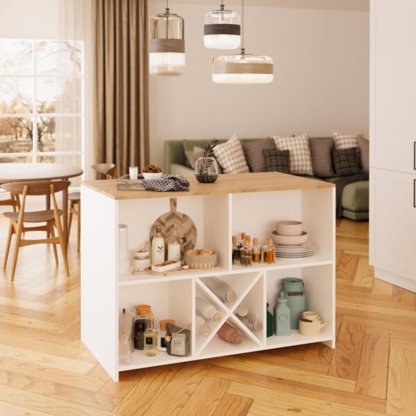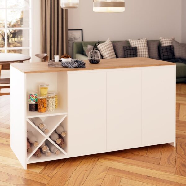 Bimossa Gustav L4710 Mutfak Adası 160 cm – Beyaz Ahşap Üst, Şaraplık, Bar Masası Çok Amaçlı Depolamalı Dolap