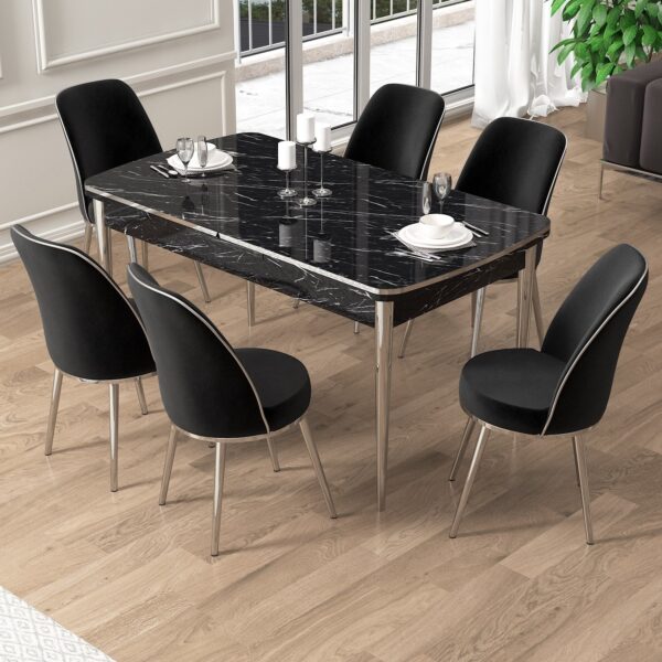 Are SERISI 80 x 132 cm Mdf Açılabilir Siyah Mermer Desen Masa Takımı 6 Sandalye Gümüş Halkalı