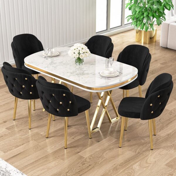 Zae Serisi 90X168 Lak Panel Beyaz Mermer Desen Gold Ayak Masa Takımı 6 Sandalye
