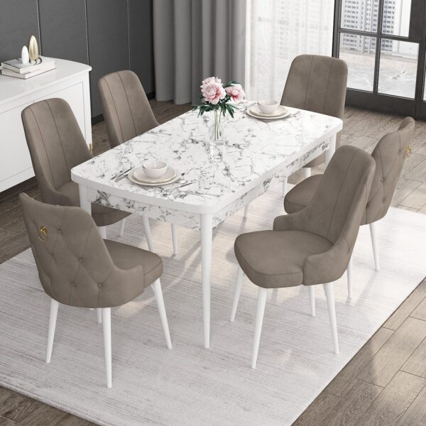 Canisa Concept Noa Serisi, 80X132 Açılabilir Mdf Masa, Beyaz Mermer Desen Mutfak Masa Takımı, 6 Sandalye