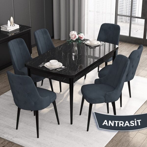 Canisa Concept Roy Serisi, 80 x 132 cm Açılabilir Mdf Mutfak Masa Takımı,siyah Mermer Desen Masa 6 Sandalye