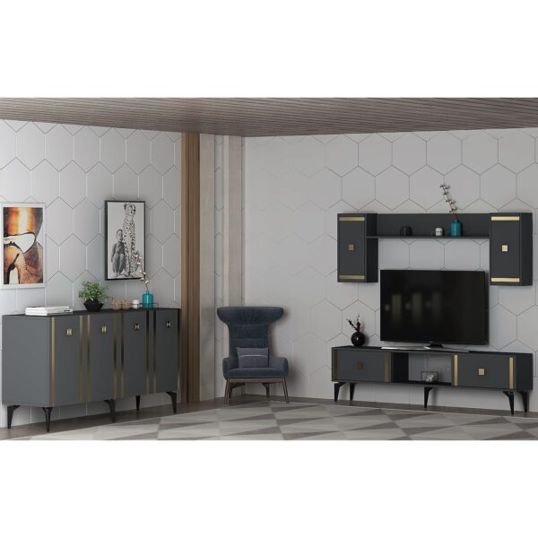 Demonte Dekor Doruk Tv Ünitesi ve Konsol 2’li Salon Takımı Antrasit Altın