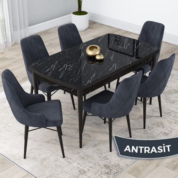 Canisa Concept Kar Serisi 80 x 132 cm Açılabilir Mdf Mutfak Masa Takımı Siyah Mermer Desen Masa 6 Sandalye