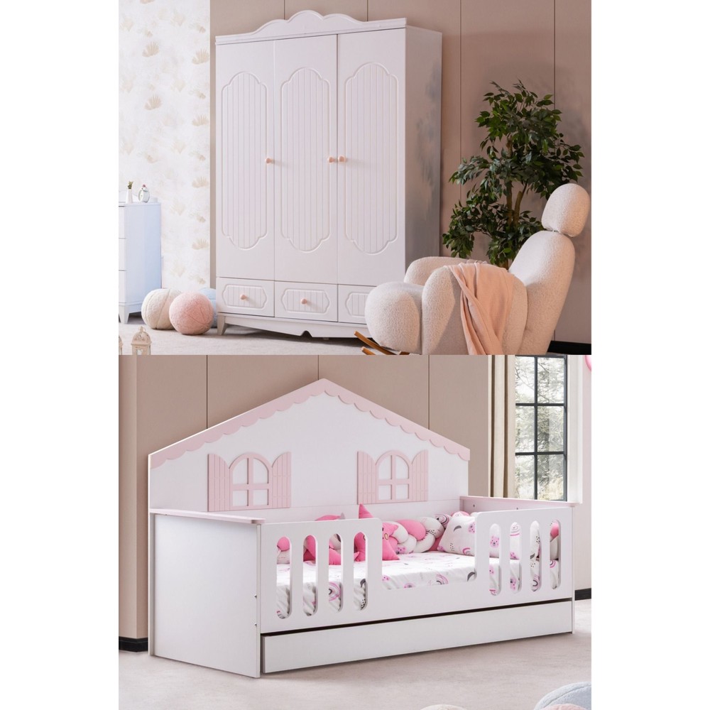 Poli Çocuk Odası Takımı, Poli Yavrulu Karyola, Flower 3 Kapaklı Dolap – Pembe