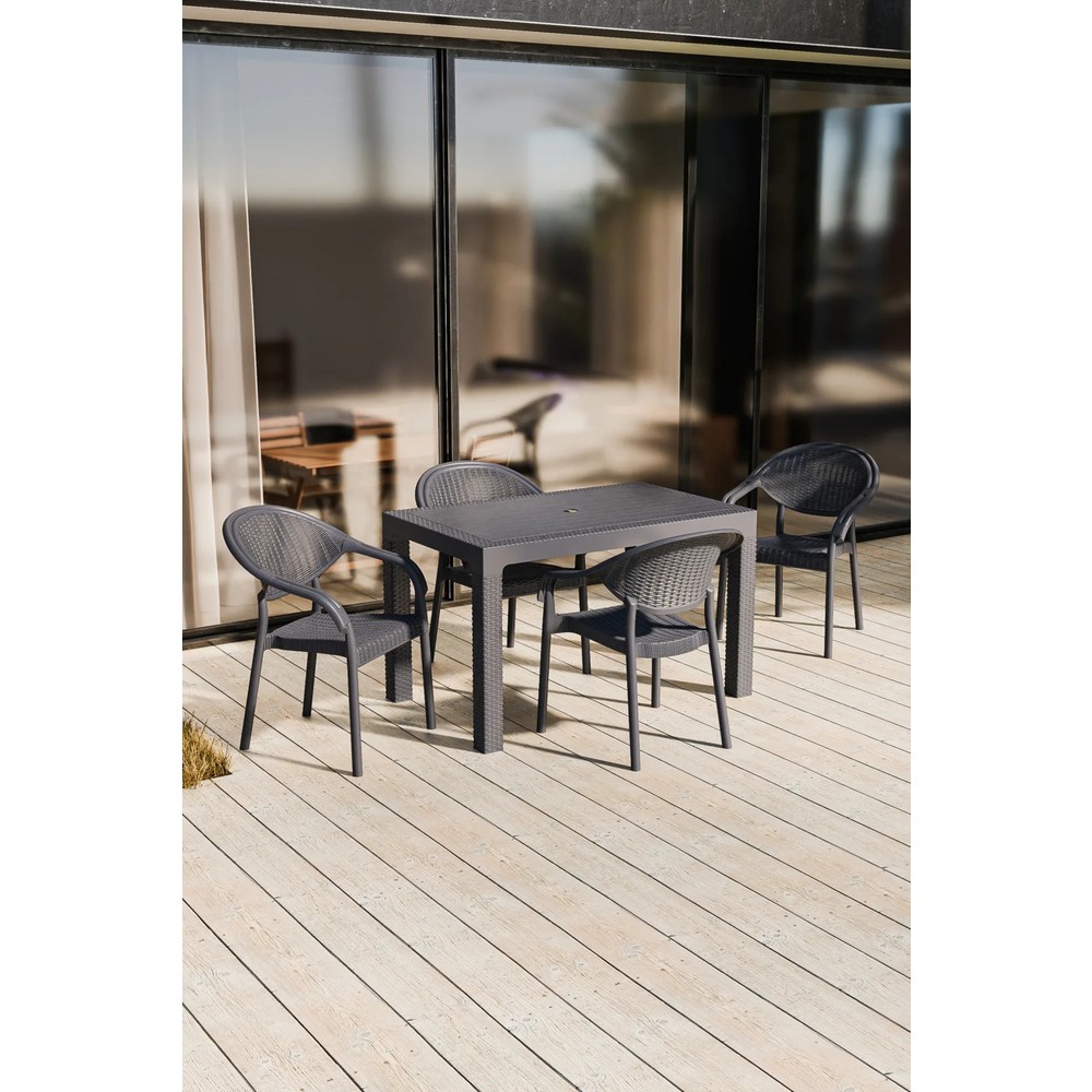 modern tasarımıyla dikkat çeken raddan camsız masa takımı, bahçe, balkon veya terasınızda şıklığı ve konforu bir arada sunar.- Dört adet sandalye ile tamamlanan bu set, misafirlerinizi ağırlarken rahat bir ortam sağlar.- Plastik malzemeden üretilmiş olup dayanıklılık ve kolay temizlenebilirlik özellikleriyle öne çıkar.- Türkiye’de üretilmiş olması sayesinde yerel kaynakların etkin kullanımını desteklerken kalite standartlarını da korur.- 120×70 cm ölçülerindeki masa, geniş yüzey alanı ile yemeklerinizde veya sohbetlerinizde bolca alan sunar.