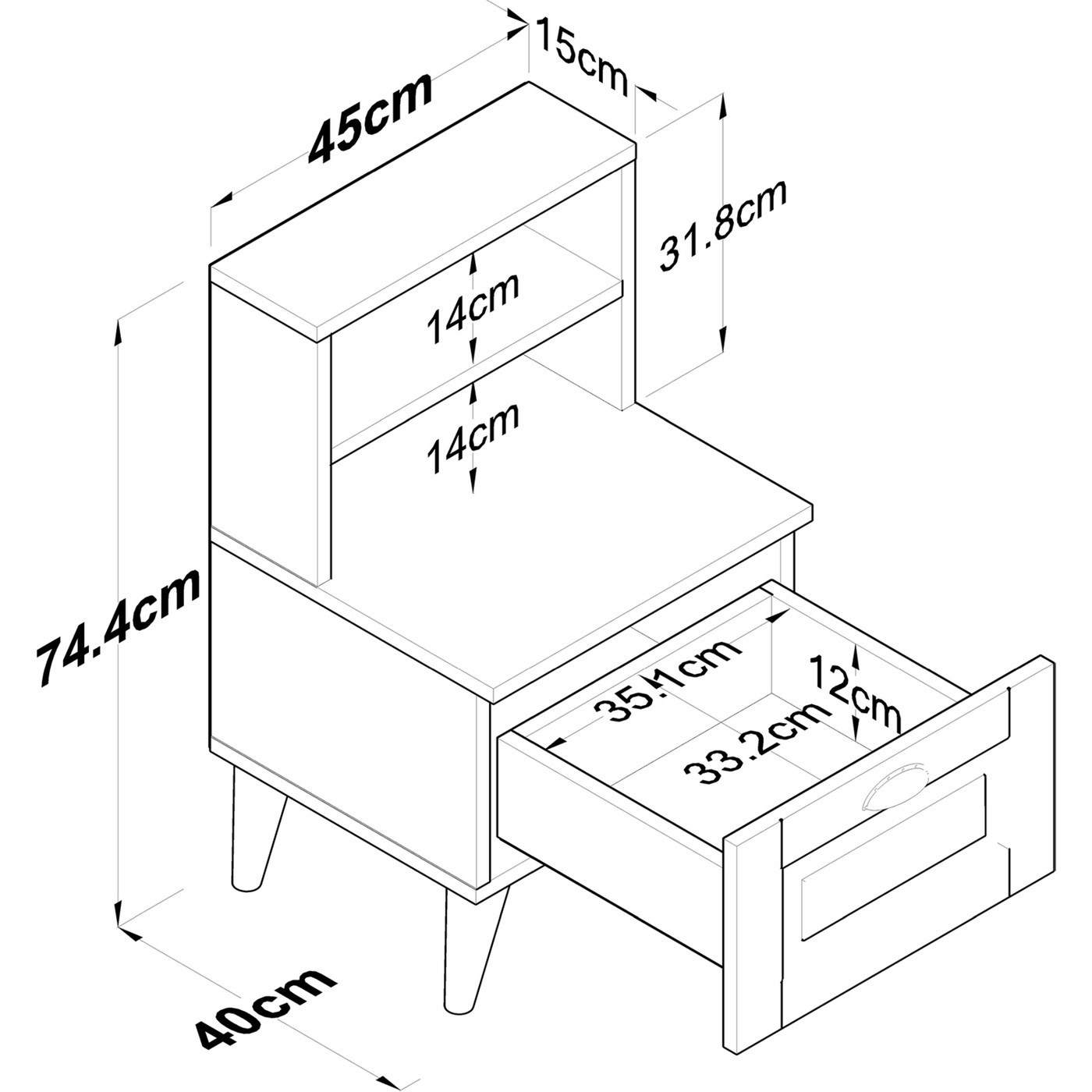 Komodin: Genişlik: 45 cm – Derinlik: 40 cm – Yükseklik: 74,4 cm