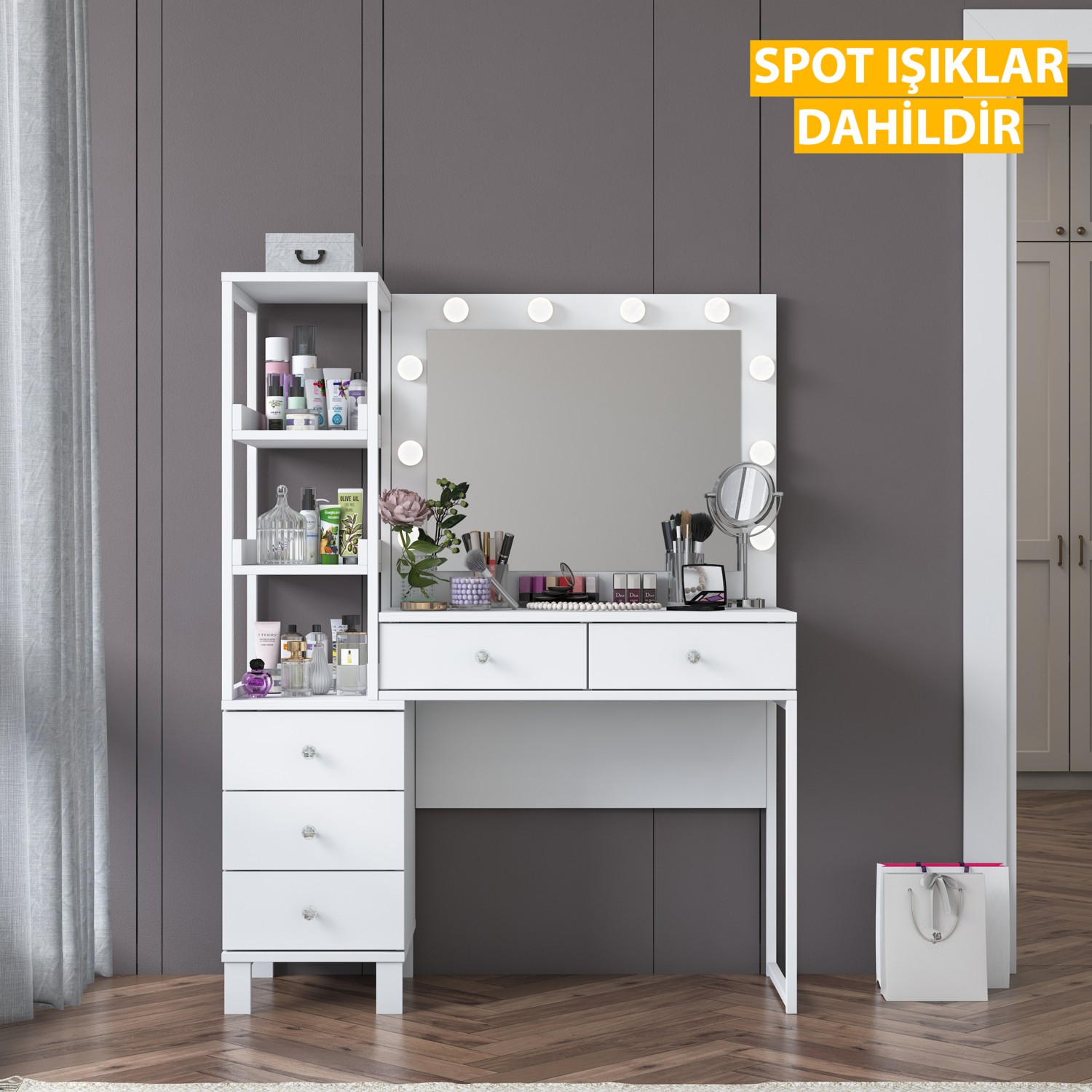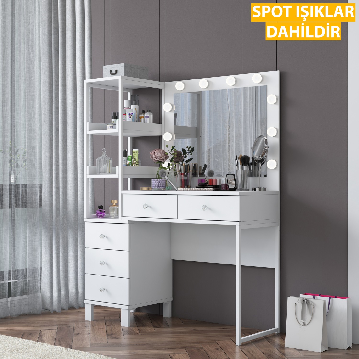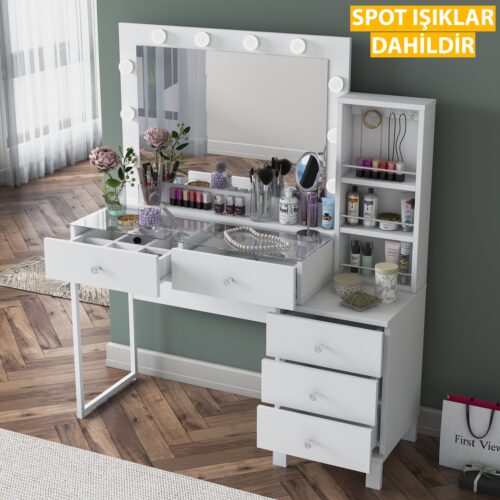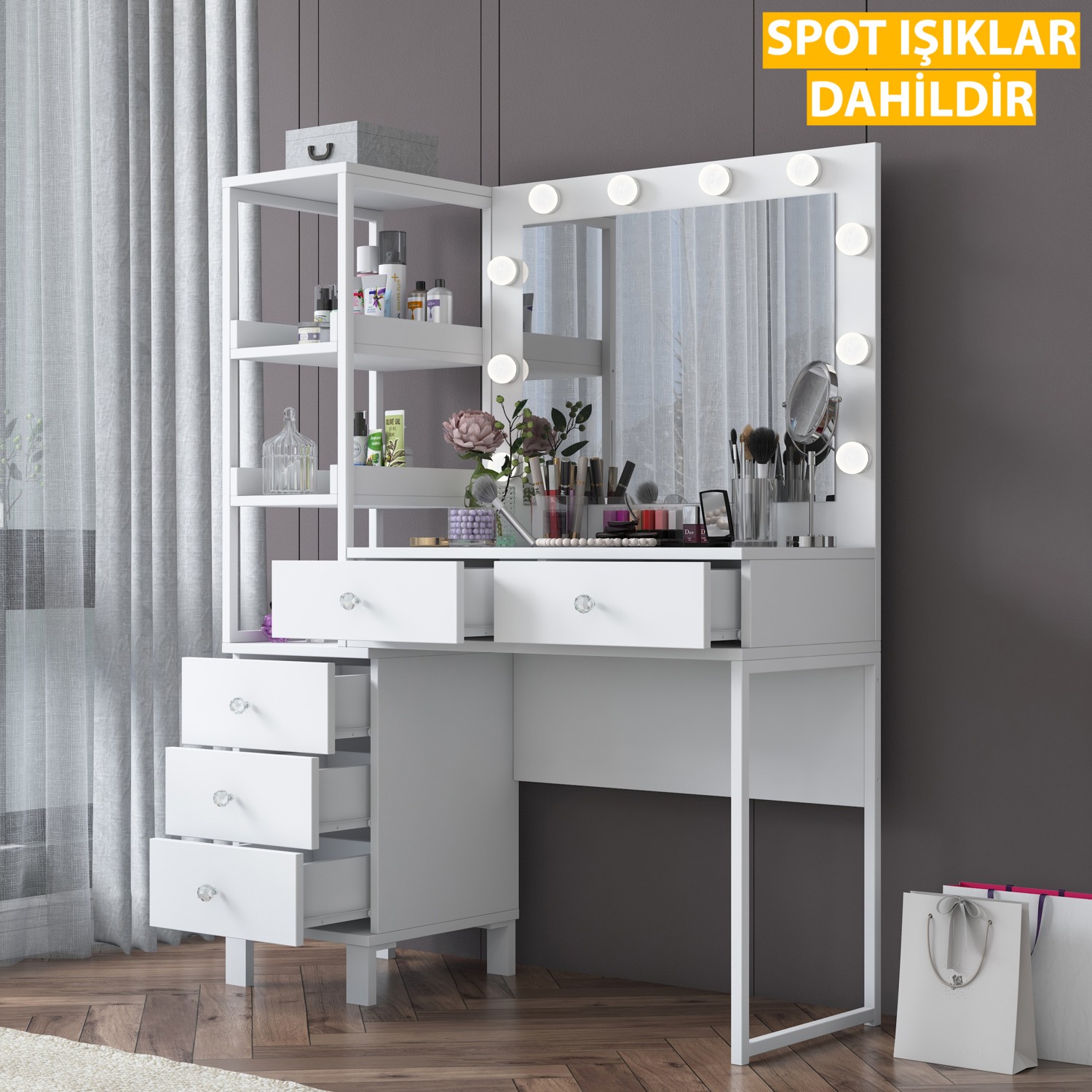 Rani BJ128 Hollywood Işıklı Aynalı Kulis Makyaj Masası 5 Çekmeceli Raflı Takı Düzenleyici Beyaz