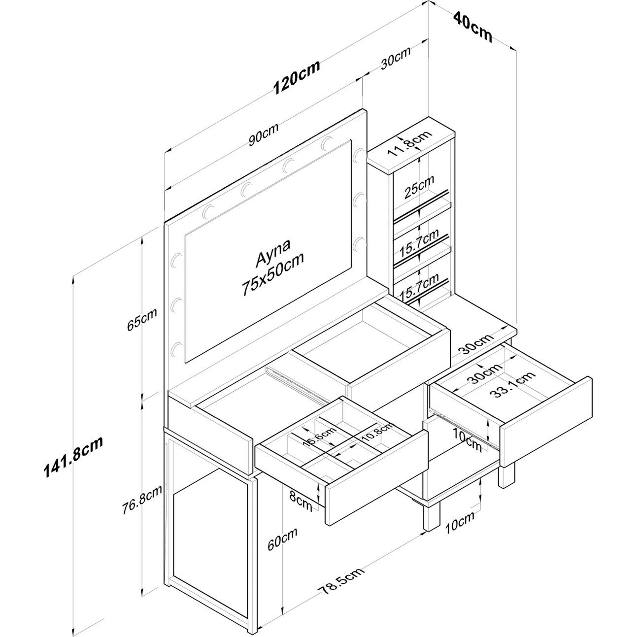Makyaj Masası: Genişlik: 120 cm – Derinlik: 40 cm – Yükseklik: 141,8 cm