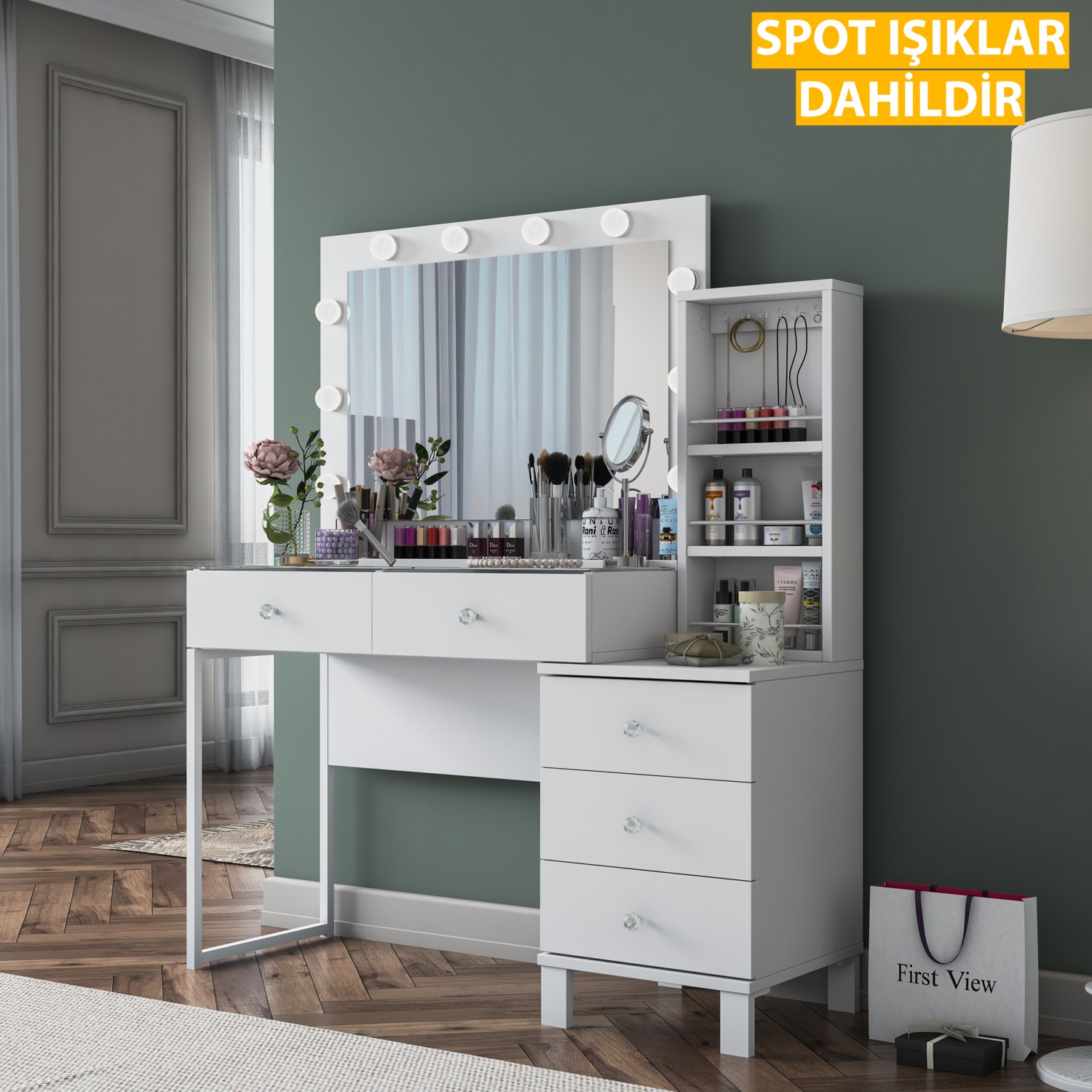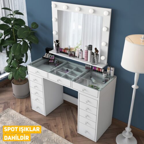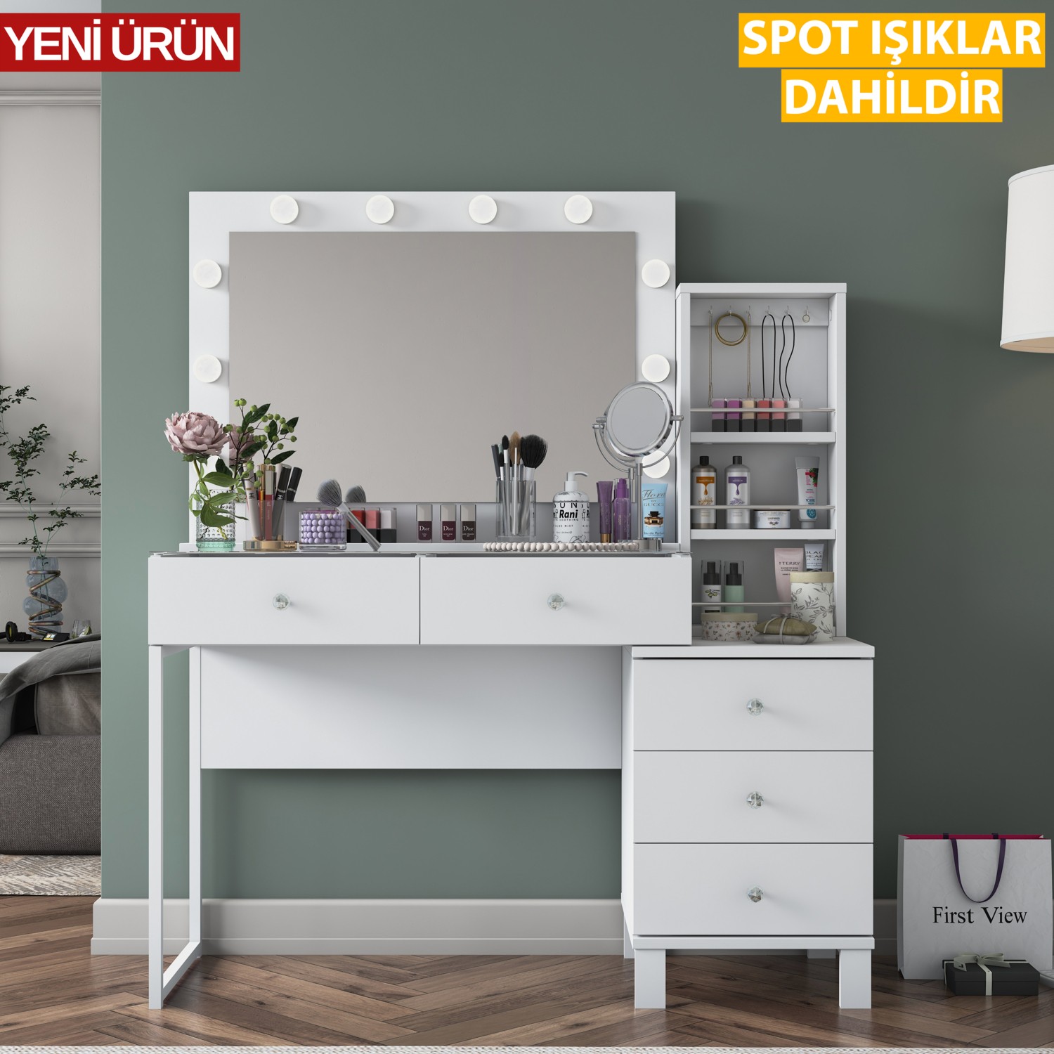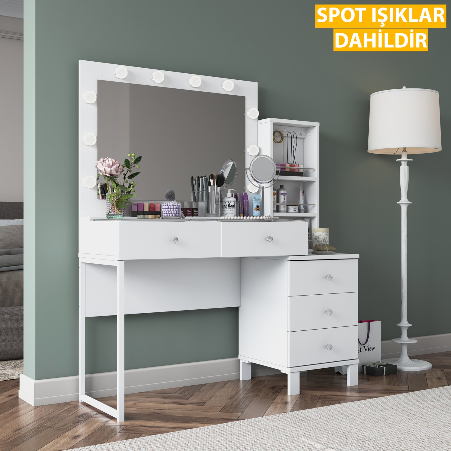 Rani BJ151 Hollywood Işıklı Aynalı Kulis Makyaj Masası Cam Tablalı 5 Çekmeceli Takı Düzenleyici Beyaz