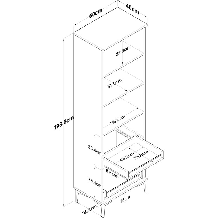 Genişlik: 60 cm – Derinlik: 40 cm – Yükseklik: 198,6 cm