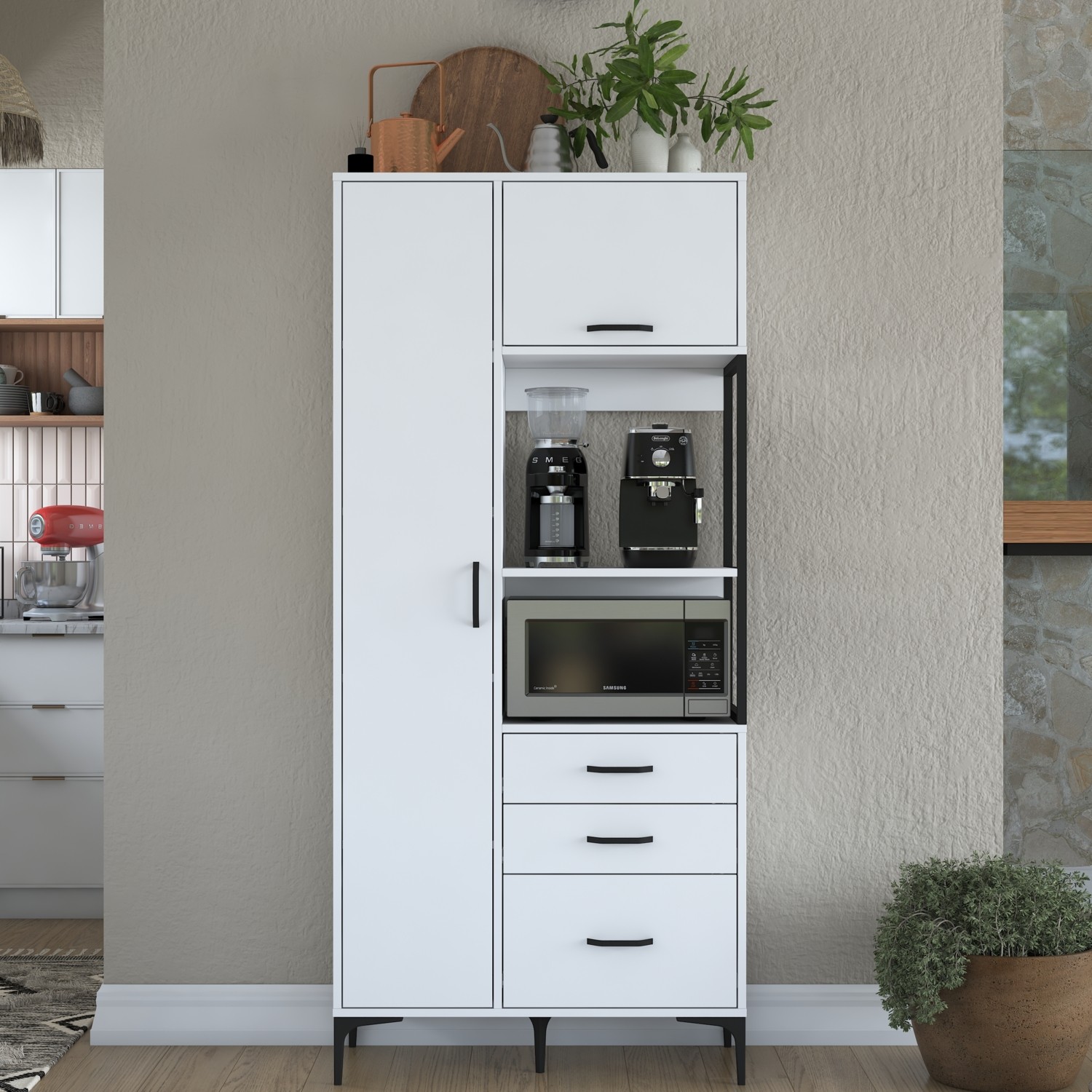 * Mikrodalga fırınınız için özel alana sahip çok amaçlı dolaba, mevsimlik hazırladığınız kavanozları, uzun süre raf ömrü olan bakliyatlarınızı koyabilirsiniz.
