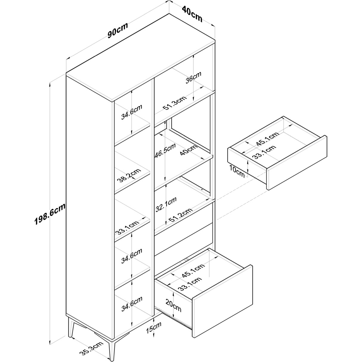 Genişlik: 90 cm – Derinlik: 40 cm – Yükseklik: 198,6 cm