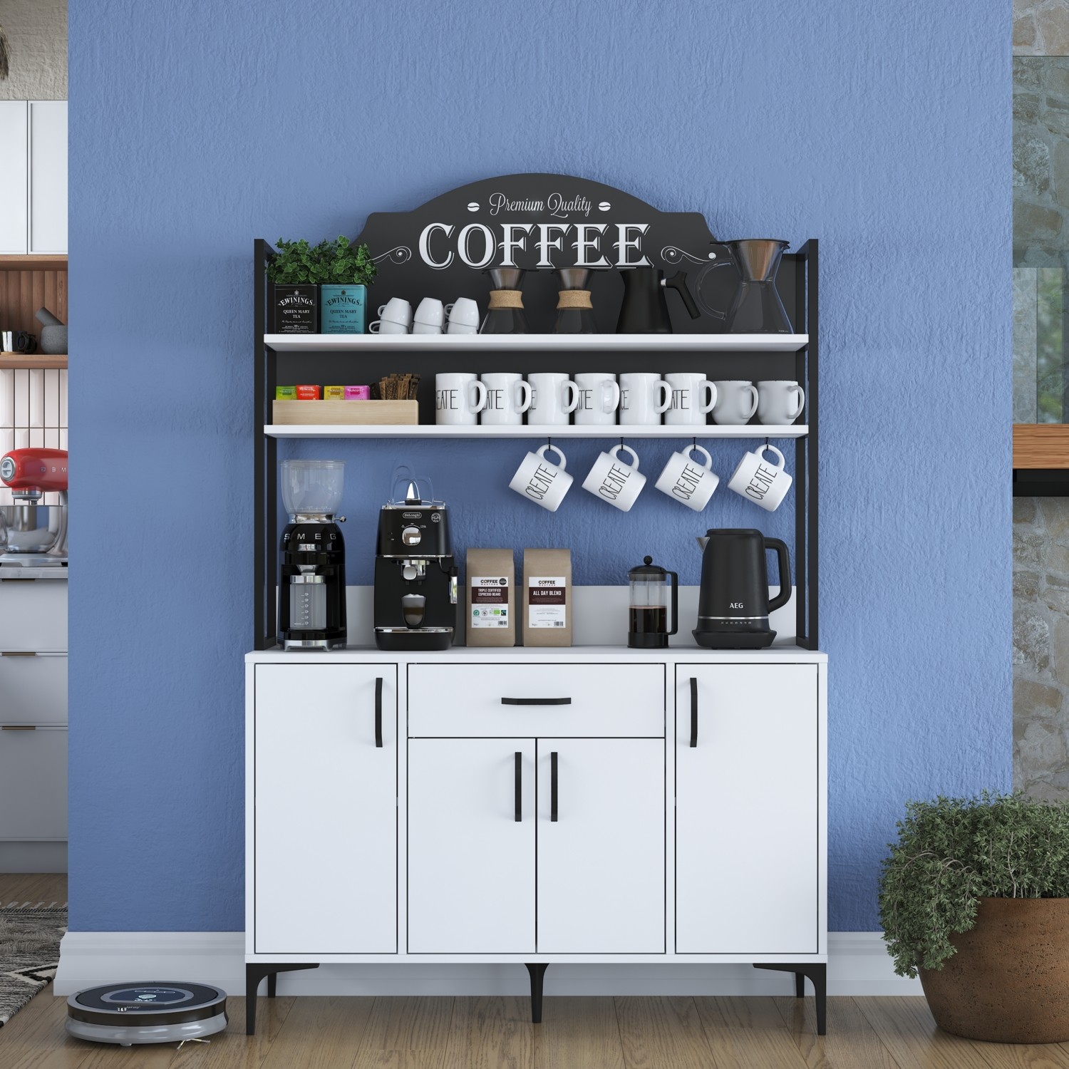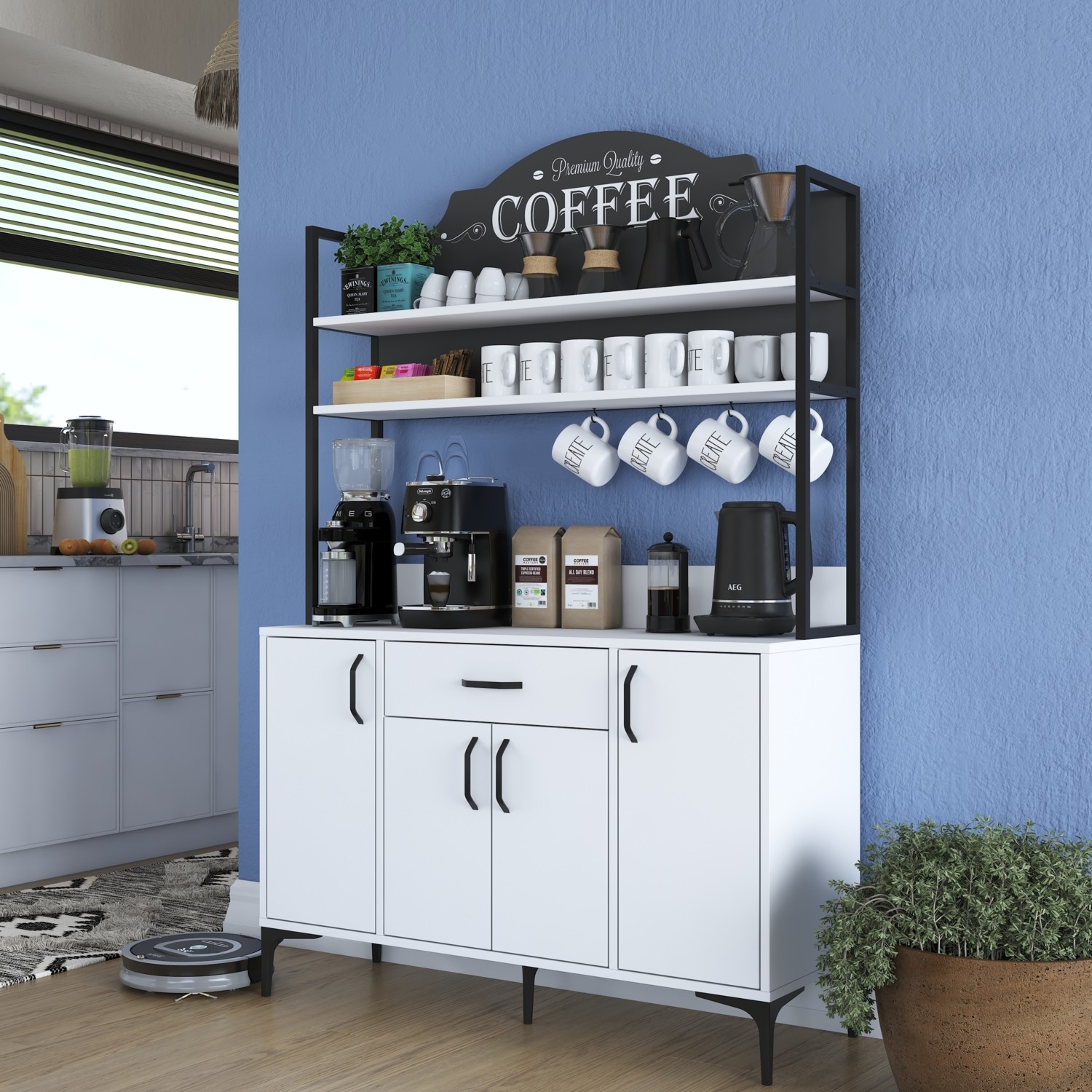 Rani JE130 Kahve Köşesi Çok Amaçlı Dolap 4 Kapaklı 1 Çekmeceli Kiler Mutfak Dolabı Beyaz