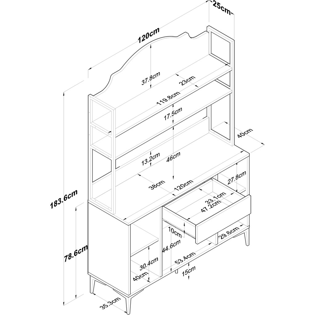 Genişlik: 120 cm – Derinlik: 40 cm – Yükseklik: 183,6 cm